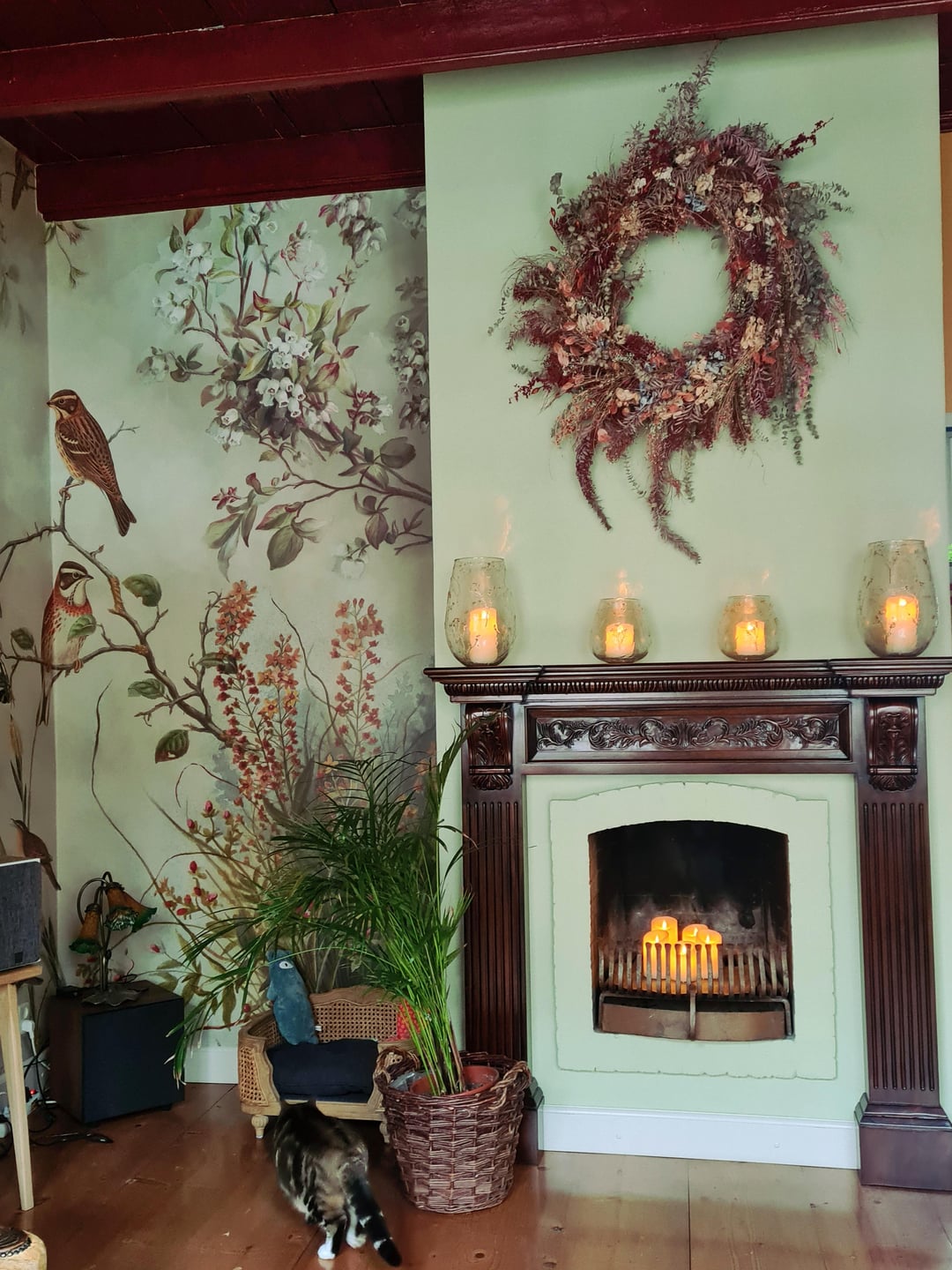 Without. The first pic had me so confused with perspective, because I thought the cat bed was a human armchair 😂. Beautiful room, with or without the plant!