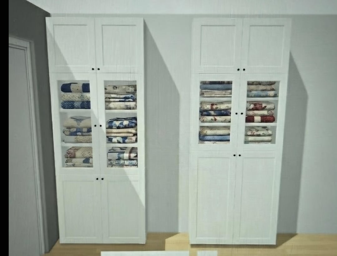 Im using Ikea cabinets to make some built ins at the end of a hallway, either option will have a 3" filler the whole way around that matches the wall color to make it feel like a built in! I have a huge hall closet so I'm not concerned with maximizing storage space but more motivated by how this looks. The display portion will be used for my quilts!