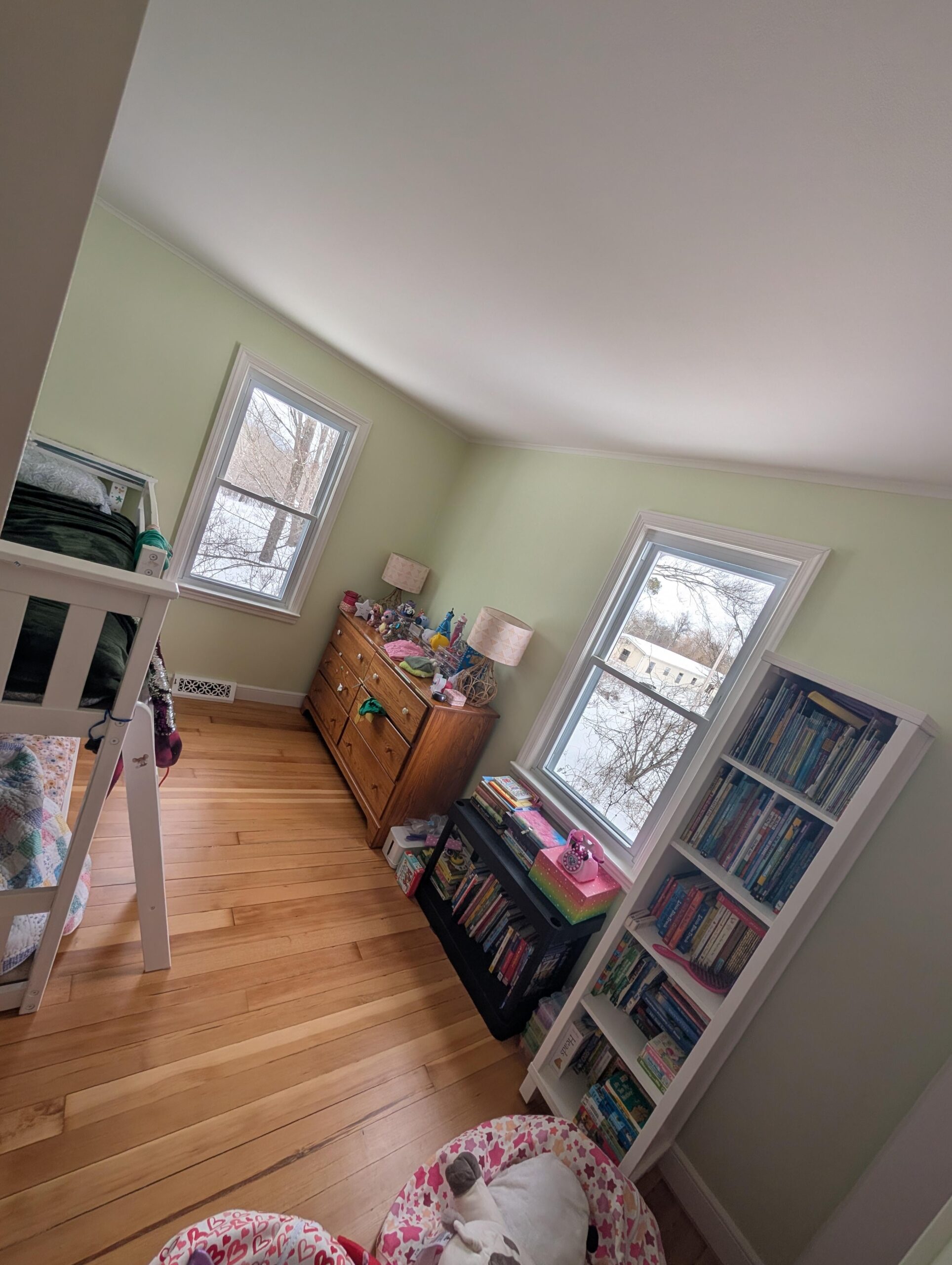 The room is small and organized "galley" style. just off camera are two side by side closets that are 4' wide each covering that wall. The shelving under the window I'll replace with something similarly side but better designed.