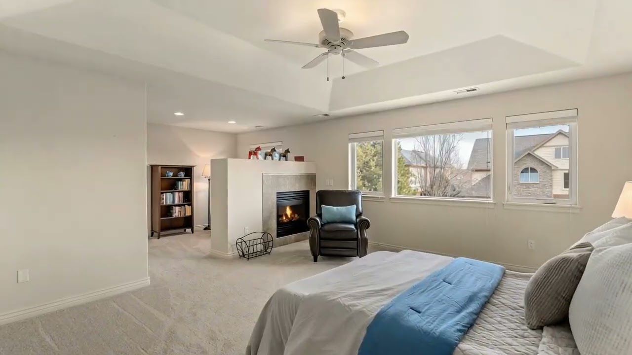 Upstairs, double doors open to the primary suite, a true retreat with picture windows, a sitting area, and a two-way gas fireplace. The luxury five-piece primary bathroom features slate flooring, dual vanities with generous storage, a large glass and tile shower, and a relaxing jacuzzi tub. A spacious walk-in closet completes the suite.