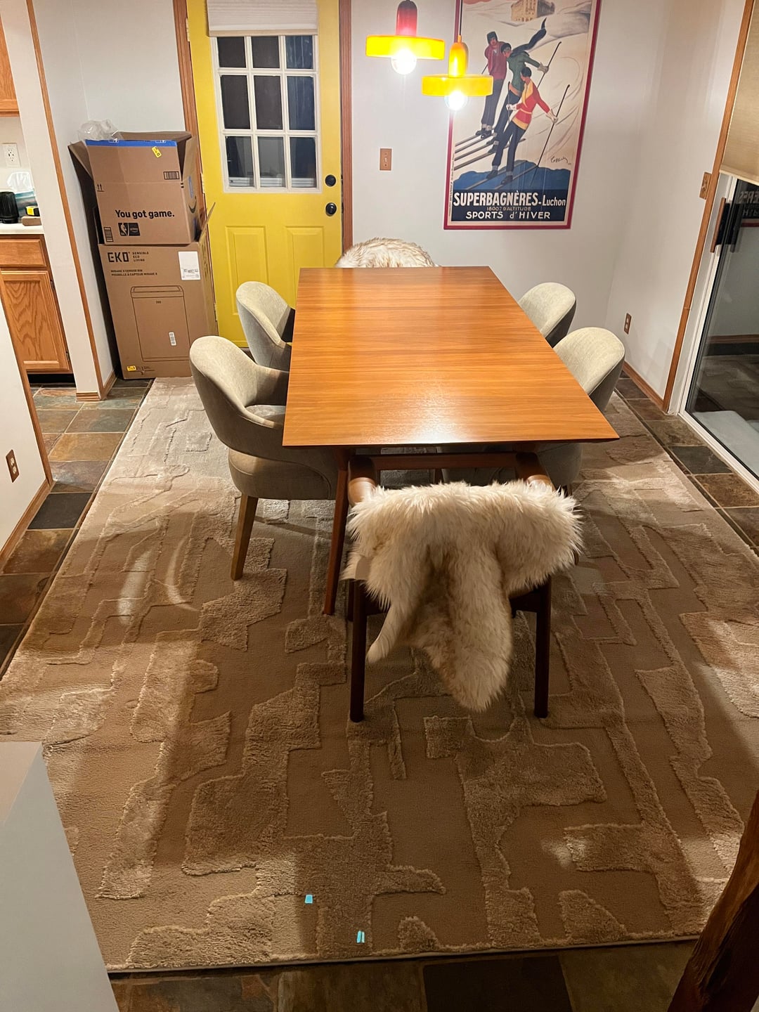 No, it’s probably not too big. You want the rug centered under the table and lined up with the hanging lights not the whole room. As long as the chairs stay on the rug when you pull them out, you’re good. If it’s almost touching the walls, then it’s too big.