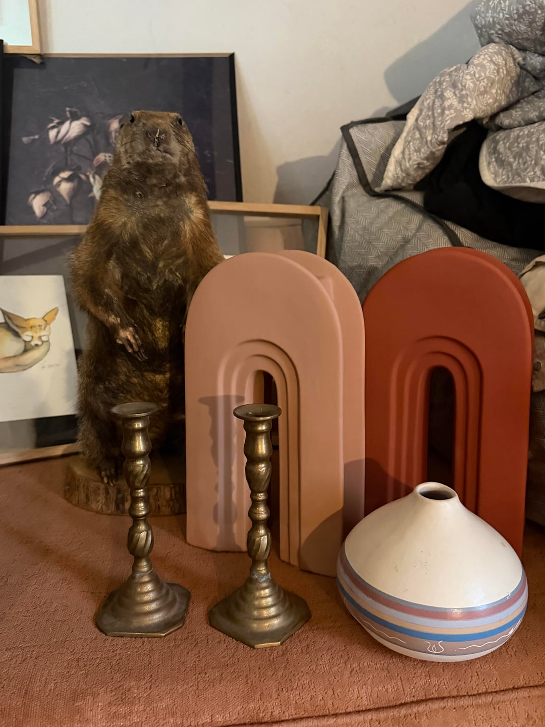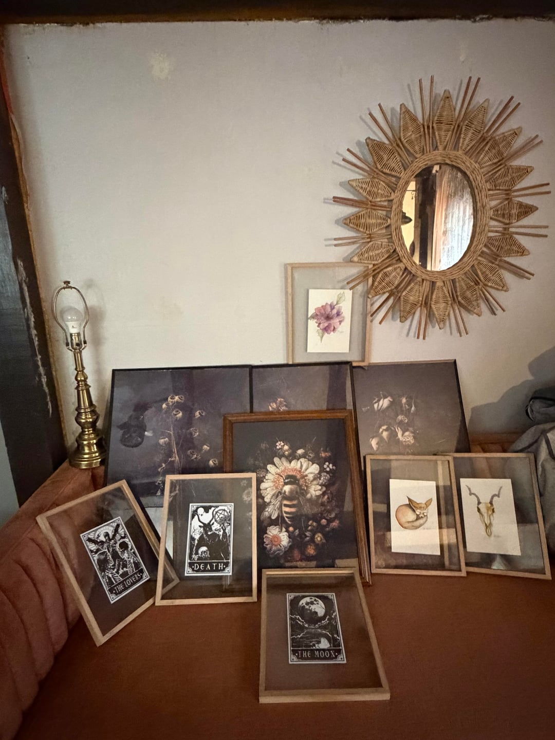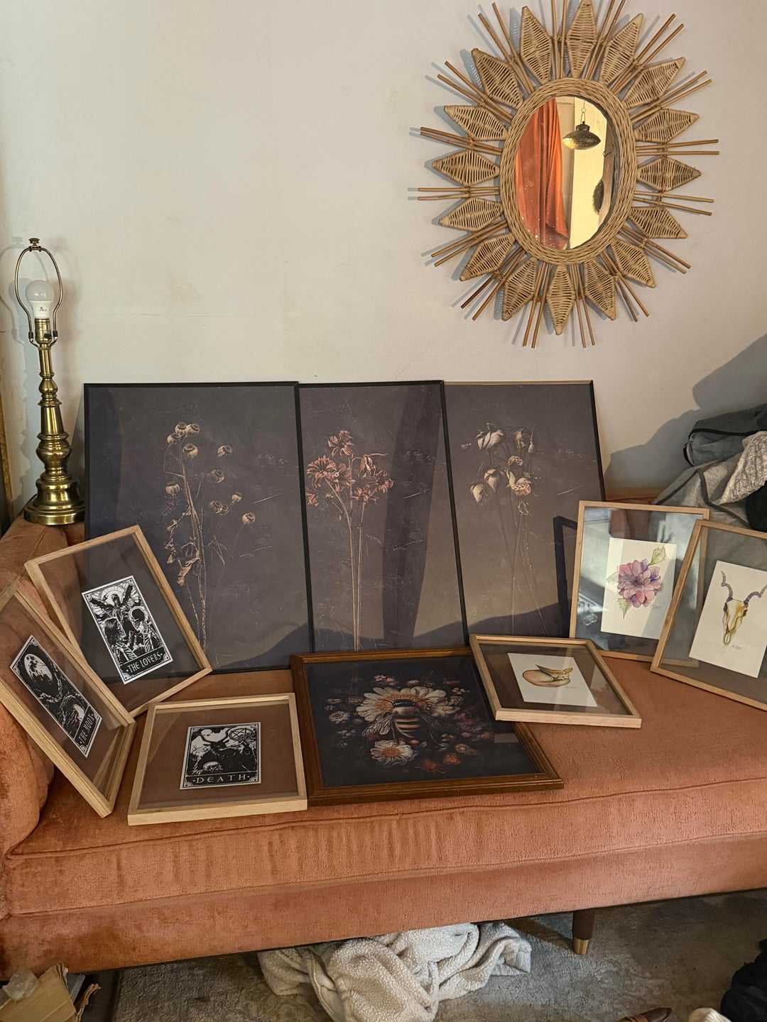 Hello, I just moved into my own studio apartment and I am in the process of redecorating. I have a little bit of a weird layout, but it’s just me and my two dogs so it’s perfectly fine. The kitchen and the living room room share a space, and my couch is 93 inches long and it’s from Joy bird.(Chelsea) and it is in the color terra-cotta rose I believe. I’m having a hard time figuring out if I should get a large round rug for the living room, or if I should get a rectangle rug for the space. I do have some furniture to use to separate the spaces, but I do believe that using rugs in small areas also really make a huge difference. So any advice or input would be great, I’m unsure of the shape in the color that I should get that would complement my decorating. I will put some pictures of the color scheme I’m going with, but I do like a lot of natural wood, brass, I’m definitely one of those girls who likes antique things, I prefer real wood and real material over fake material any day, no hate for anybody who doesn’t feel that way, this is just my personal preference. I think houses look beautiful that aren’t decorated in my style 🖤. I have a lot of animal skulls, taxidermy, wood, brass, antique vases, hutches, repurposed 3 leaf wooden table, wrought iron and wood coffee table etc (I’m trying to paint an image lol) I pretty much am going for like a muted earth tone color throughout the entire studio. I do have a lot of art that I’m going to put on the walls, and most of the walls besides, a few are going to be painted Navajo white by Benjamin Moore, it’s like an off-white, but it’s not too warm and it doesn’t have gray undertones, it’s a nice neutral white without it being extremely bright so you feel like you’re in the dentist office lol (I highly recommended, especially if you have natural wood in your house that you’re trying to preserve, it goes great with natural wood, or stained wood, whatever) below I attached some photos of the couch, the color scheme I’m going with, and some of the art that I have to still put up along with table lamps, etc.