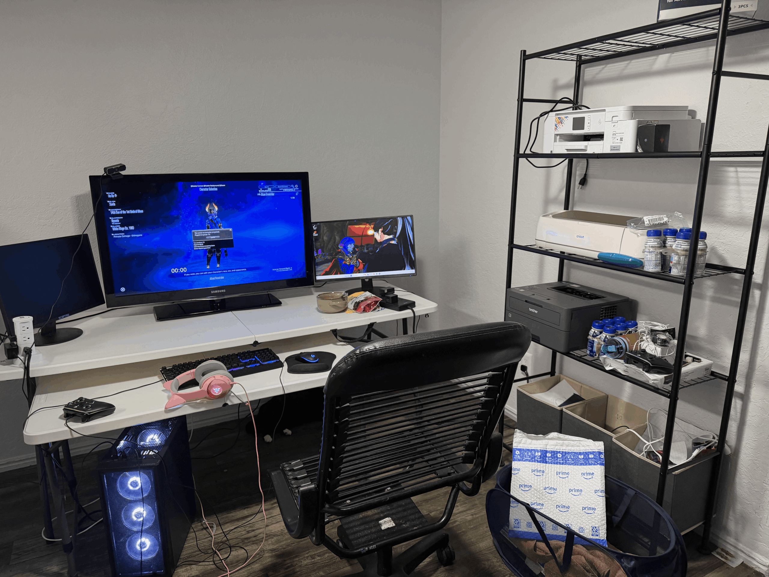 Middle "monitor" is a flatscreen TV I wasn't using, the two folding tables I got from walmart, and the smaller one is pushed underneath. Nice because it has areas the cats can lounge on, and the option for more table space via pulling the table out if and when you need it ^^