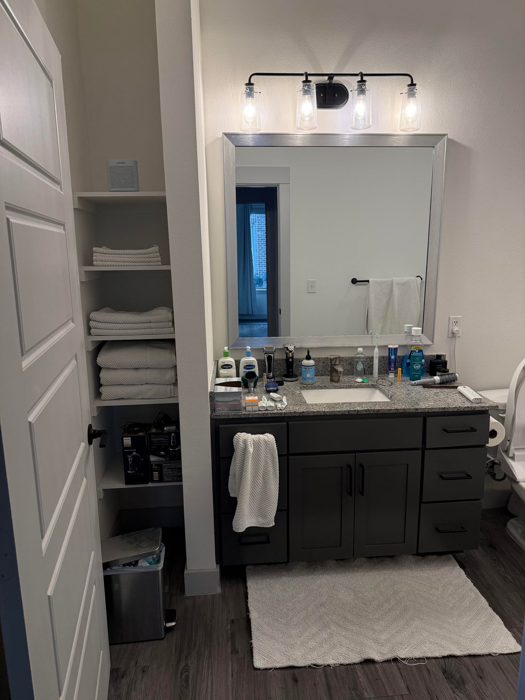 All white is a bit bland imo, so I would add some other colors and textures like a plant, wicker/ rattan baskets etc.