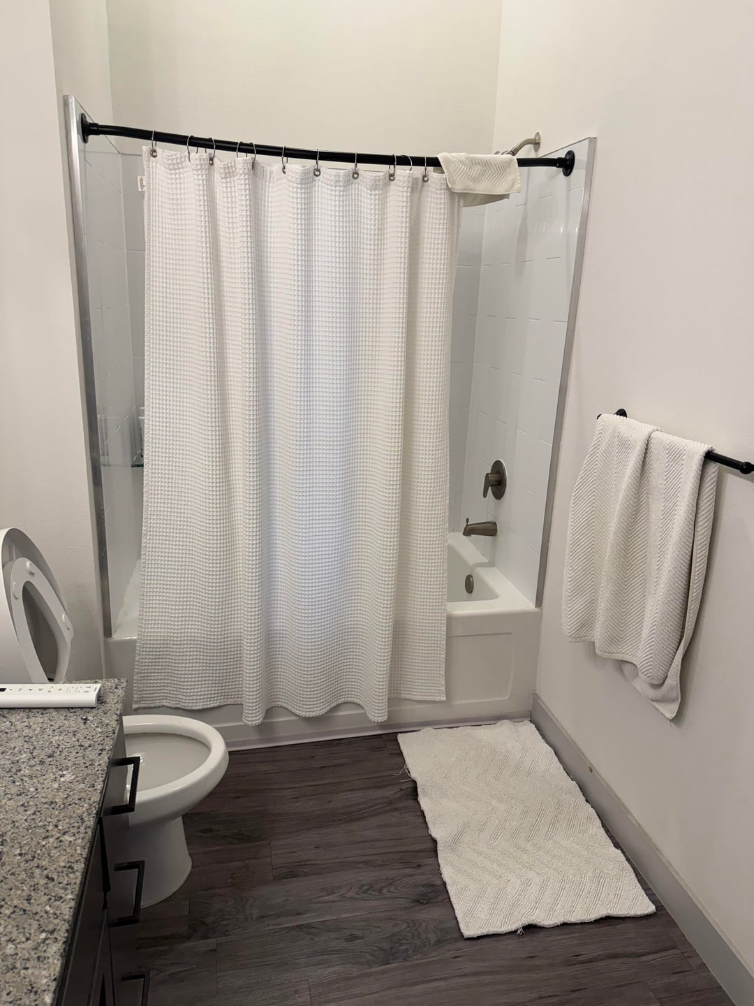 A good option would be finding a new shower curtain in colors / patterns you like and using one or two colors from it as accent colors, for towels, mats, art etc. All white is a bit bland imo, so I would add some other colors and textures like a plant, wicker/ rattan baskets etc.