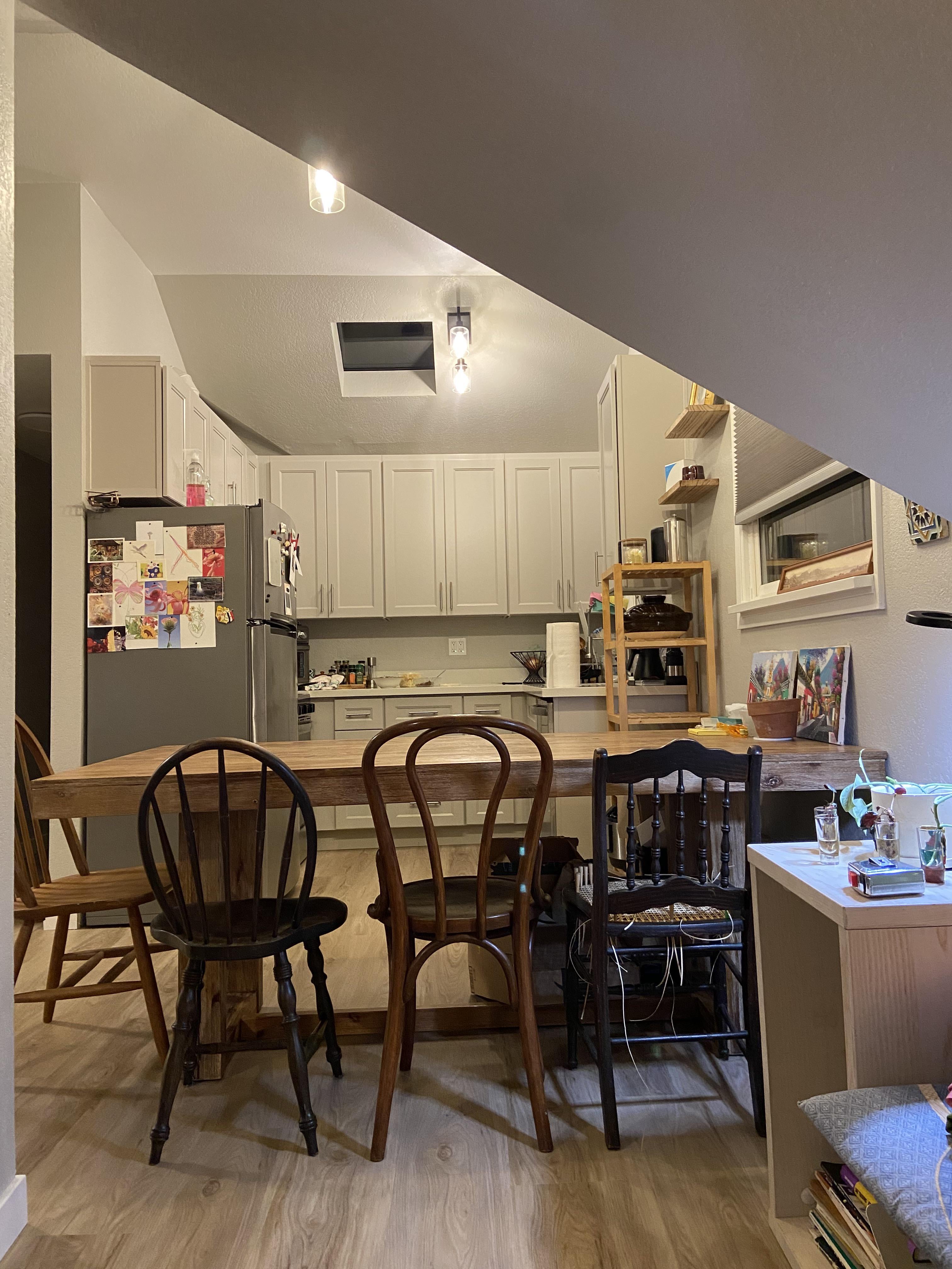I’d go with something simple, like a basic ladder back chair in a neutral color, maybe dark, then add a pop of color with a covered chair pad.