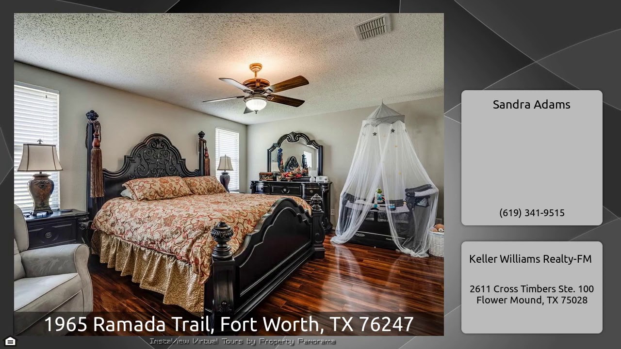 The Virtual Tour for the property at 1965 Ramada Trail, Fort Worth, TX 76247 listed for $234,900: Other homes for sale by Sandra Adams of Keller Williams Realty-FM: 4th bedroom, with French doors and closet,can be use as an office. Large Family room and Dining area are great for entertaining friends and family. Laminate flooring flows through entry and living areas. Bright eat in Kitchen with stainless appliances,walking pantry and a work station. 2nd living space is just of the Kitchen. Private Master Suite with ceiling fan and walking closet. Community pool and playground. Darling well …