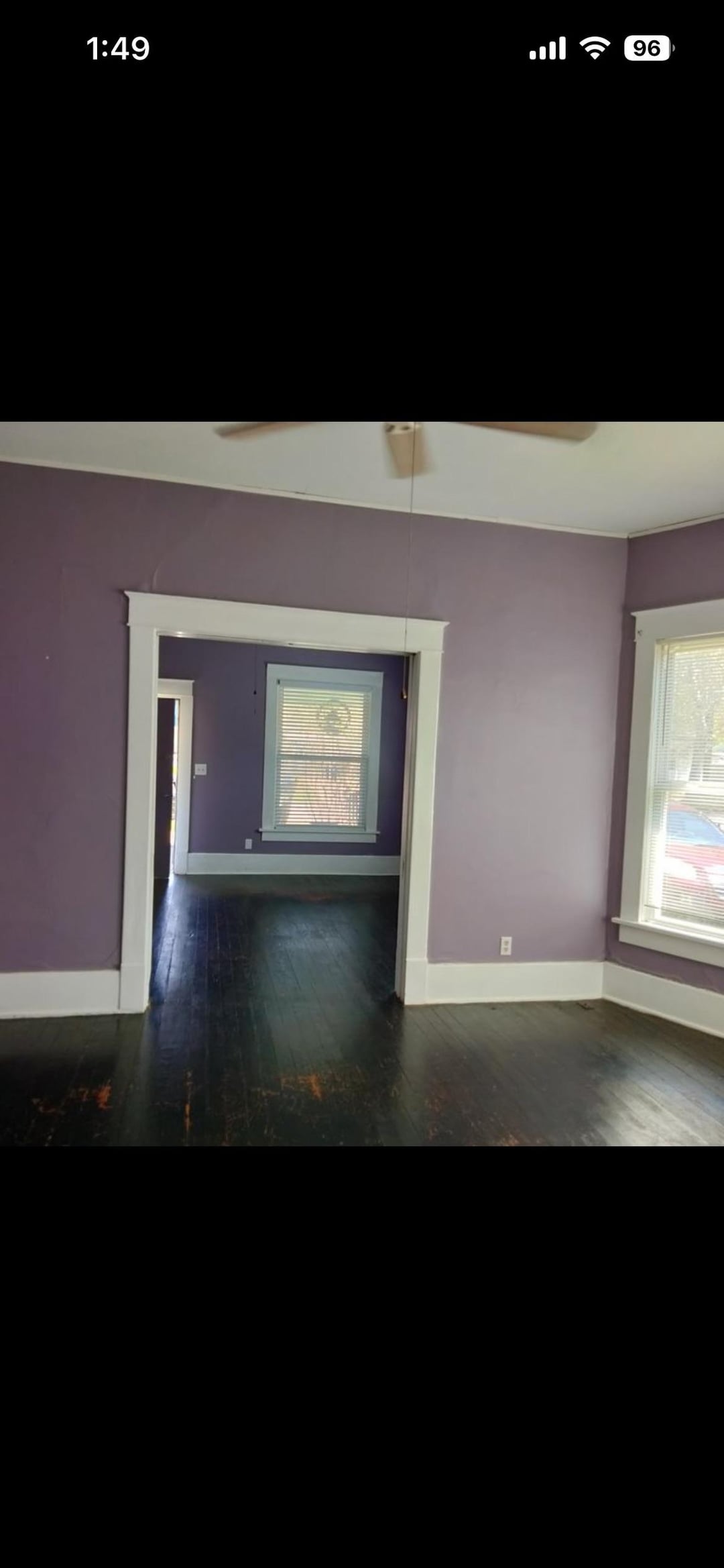 Hanging curtains to break up the purple would be a start; get curtain rods that extend well beyond the window and hang two floor to ceiling curtains per so that when open they cover the wall right and left.