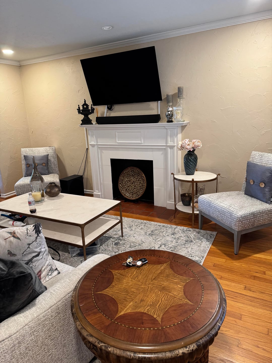 The walls are very yellow. Do you intend to keep that color…? Because everything else seems to be silver/grey which doesn’t combine well. You can minimize the clash by getting rid of those grey chairs they should just go as should that bench seat. I would put a vintage antique chest there. The whole setup looks too forced and display like. One of those tables would be nice but 3 is too much. I would change the coffee table. I would get a vintage type chair and do somwthing else on the other side. The legs don’t need to match but they need to go with or nor clash which they’re doing now. The TV really is too high. Is that where it’s best for viewing? I would’ve put it to the left of the fireplace. The coffee table is clashing with the stark white fire surround and too much marble in the room. You could paint the surround and put some more organic elements. The best thing about this space is that wooden side table. The rug is very cold, sterile and grey. I would change that to have some deeper rich color and change the cushions to cream or brown bases with color.