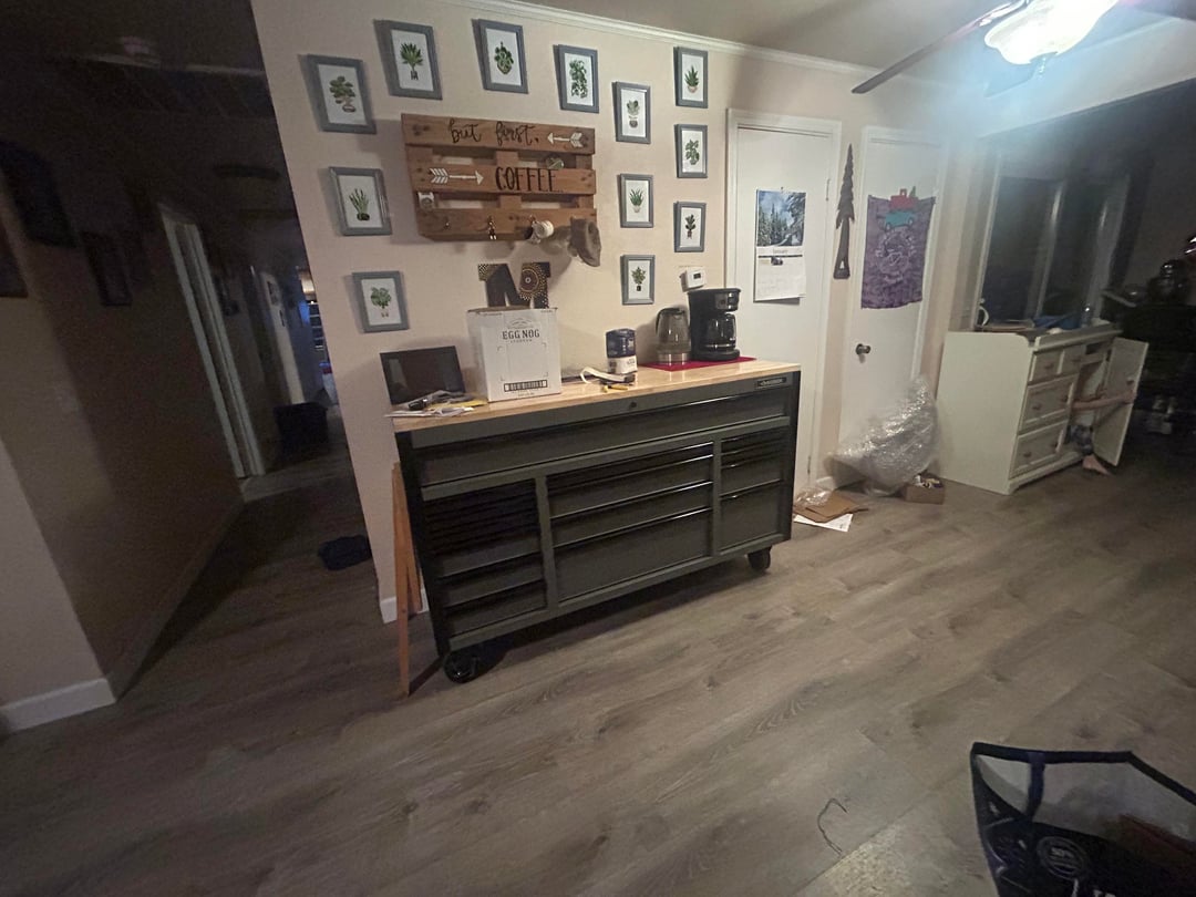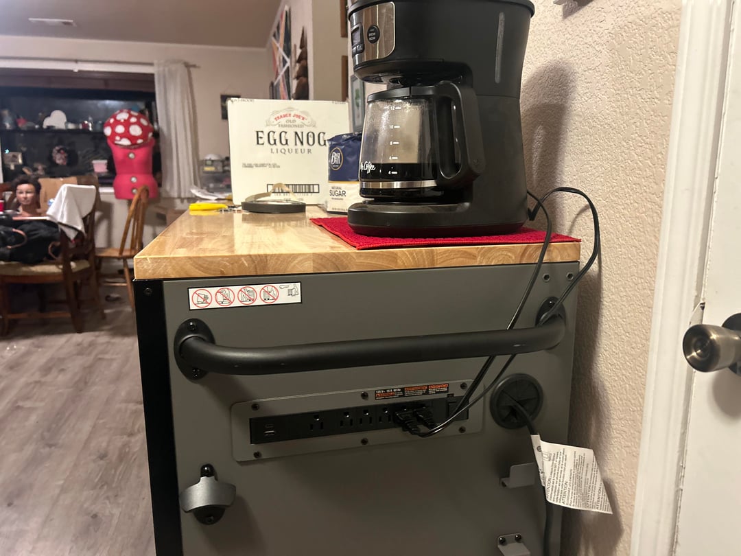 I went to Home Depot and got a rolling workbench that has a power strip on it. Generally used for tools and such. But……. I got it for the kitchen. Wife thinks it’s ghetto. I think it works and adds the much needed drawer space. It more or less makes a moveable island with power. It’s got a nice wood counter top for whatever. Can be moved around for parties and has power to keep food warm or put other beverages there.
