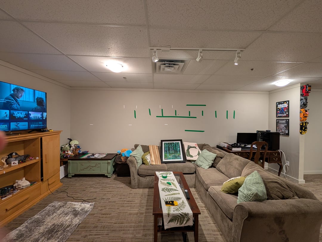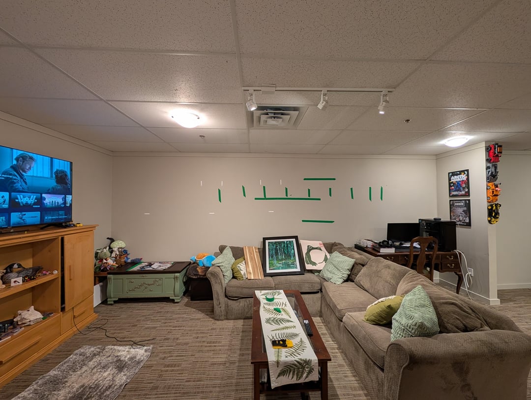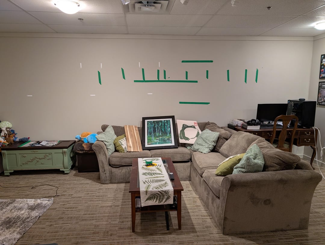 The vertical tape on the wall is studs, the horizontal is just from where I was thinking shelves could possible go (accurate lengths) and ignore the white lines, they are just command strips where I had the posters before.