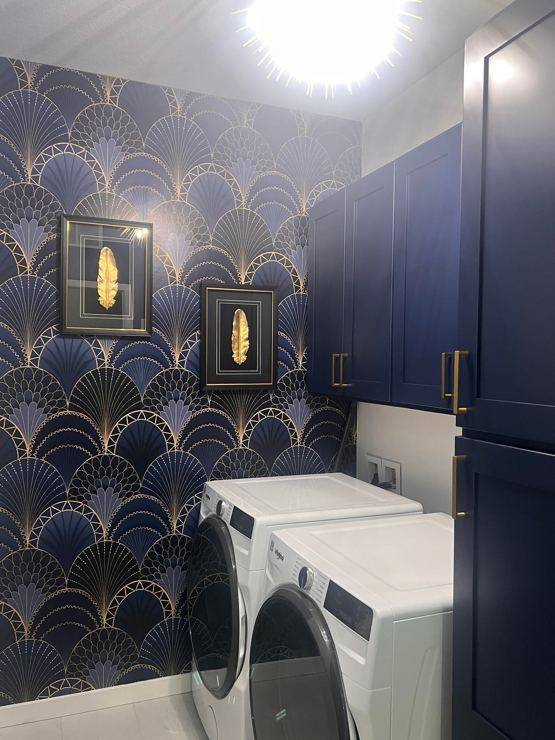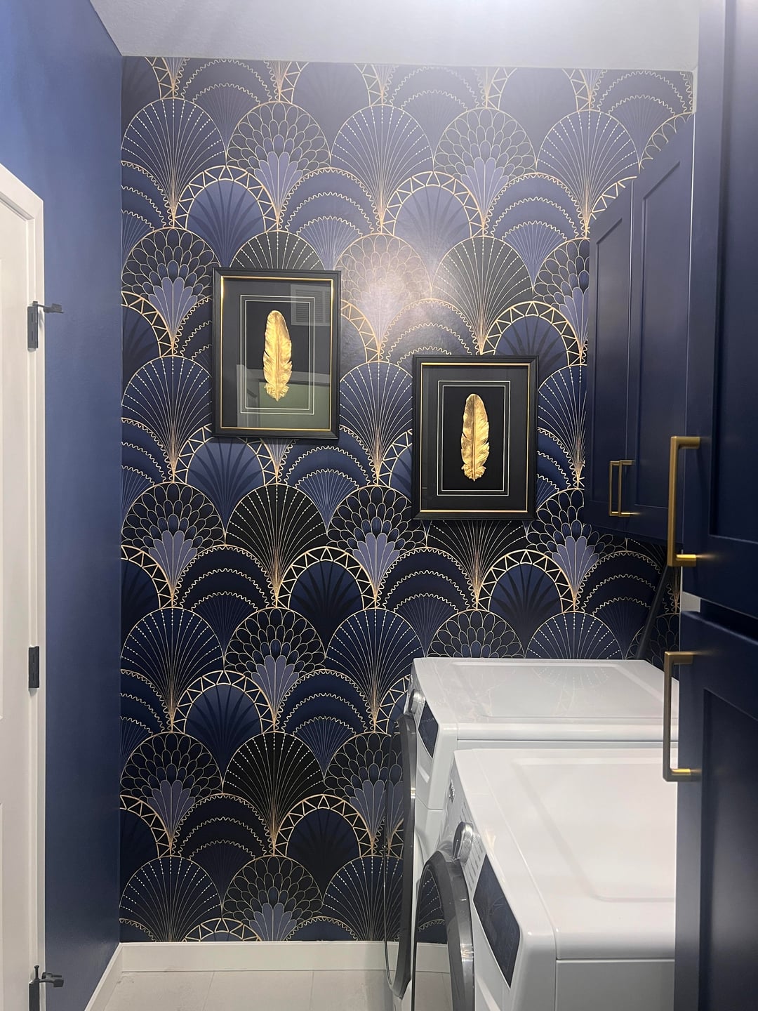 I posted here a month ago asking for opinions on which wallpaper to go with for my laundry room – something dramatic or something bright and cheery. I chose to go dramatic and love how it turned out! Still have to add a shelf to cover the water valve but wanted to share!