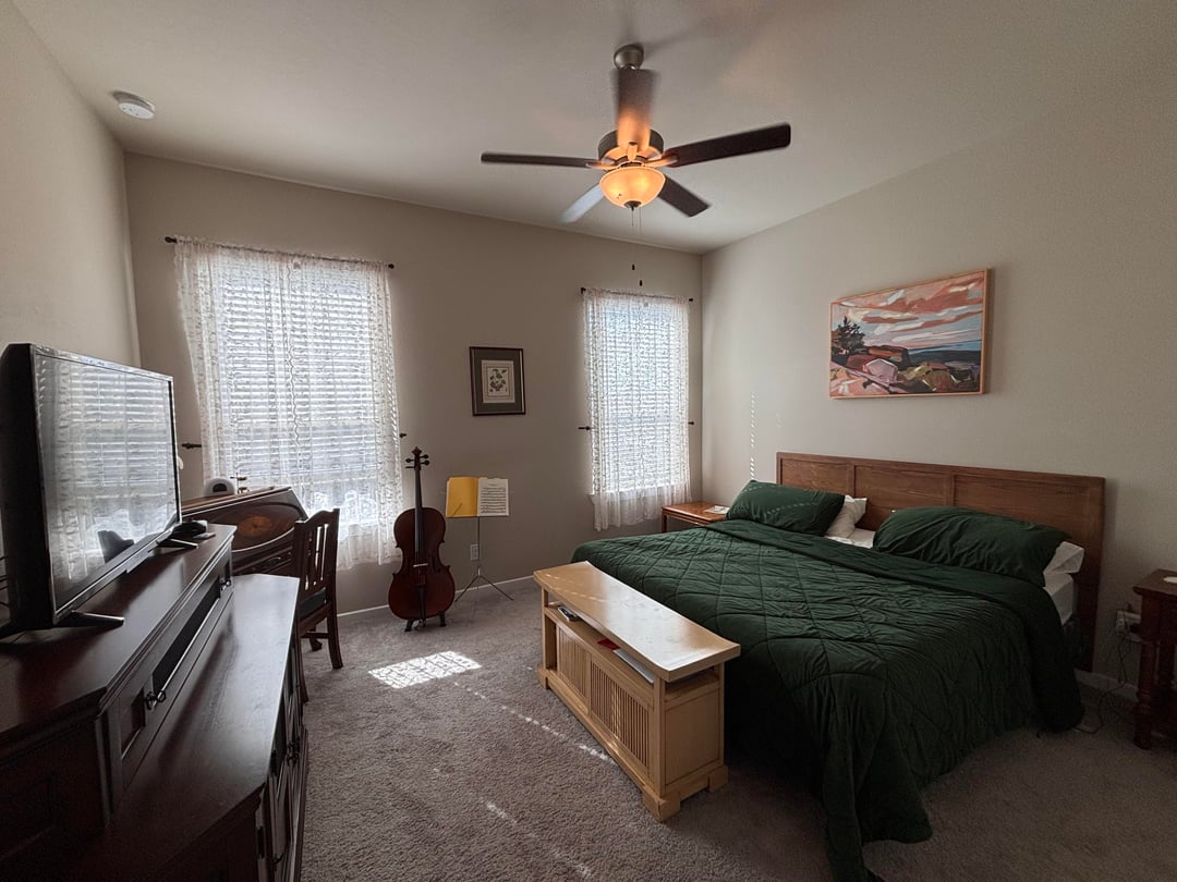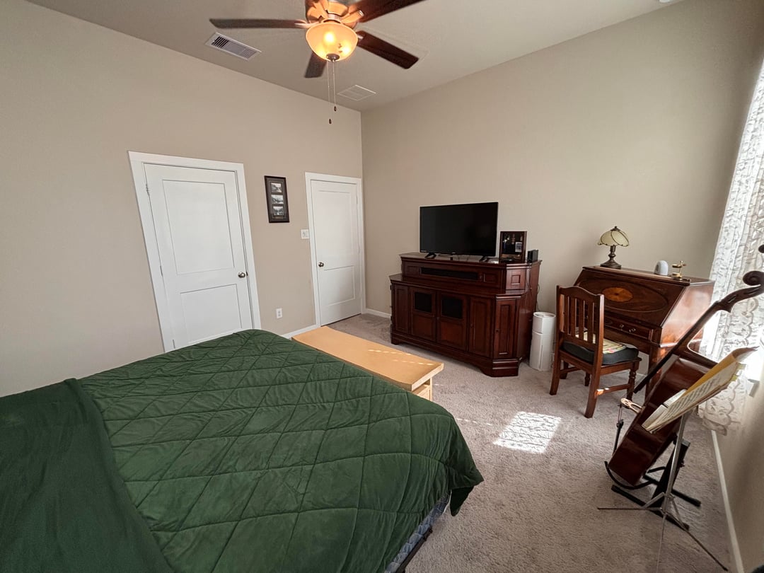 Overall I really love my bedroom. But the paint is a terrible cheap flat paint — like if you rub on it too hard it can literally rub the paint away, and it’s impossible to clean 😩 I also don’t love the beige color (my whole entire house is this color at the moment). What color you think we should go with for the walls/ceiling? I was thinking like a creamy/yellowy off white like BM’s Swiss Coffee, but idk.