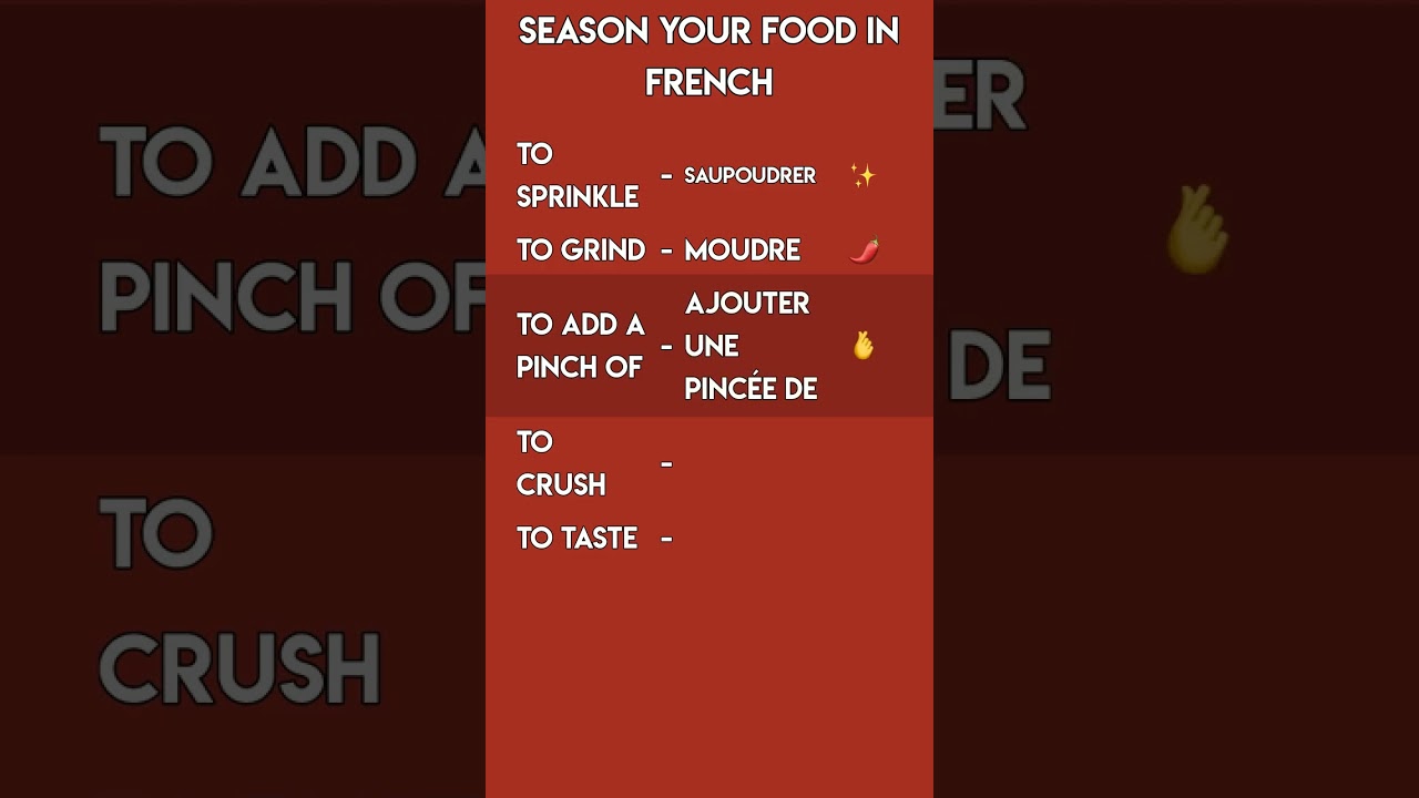 Level up your French cooking vocabulary! Learn essential verbs for seasoning food, like ‘to sprinkle’, ‘to grind’, and ‘to crush’. Perfect for following French recipes. #frenchcooking #frenchverbs #learnfrench A2 FrenchCookingcooking in frenchCuisineDiningfoodFranceFrenchfrench cuisineFrench diningfrench foodfrench lessonFrench recipesFrench verbsfrench vocabularykitchen FrenchseasonVERBSVideoVlogYouTubeWrite A CommentYou must be logged in to post a comment.