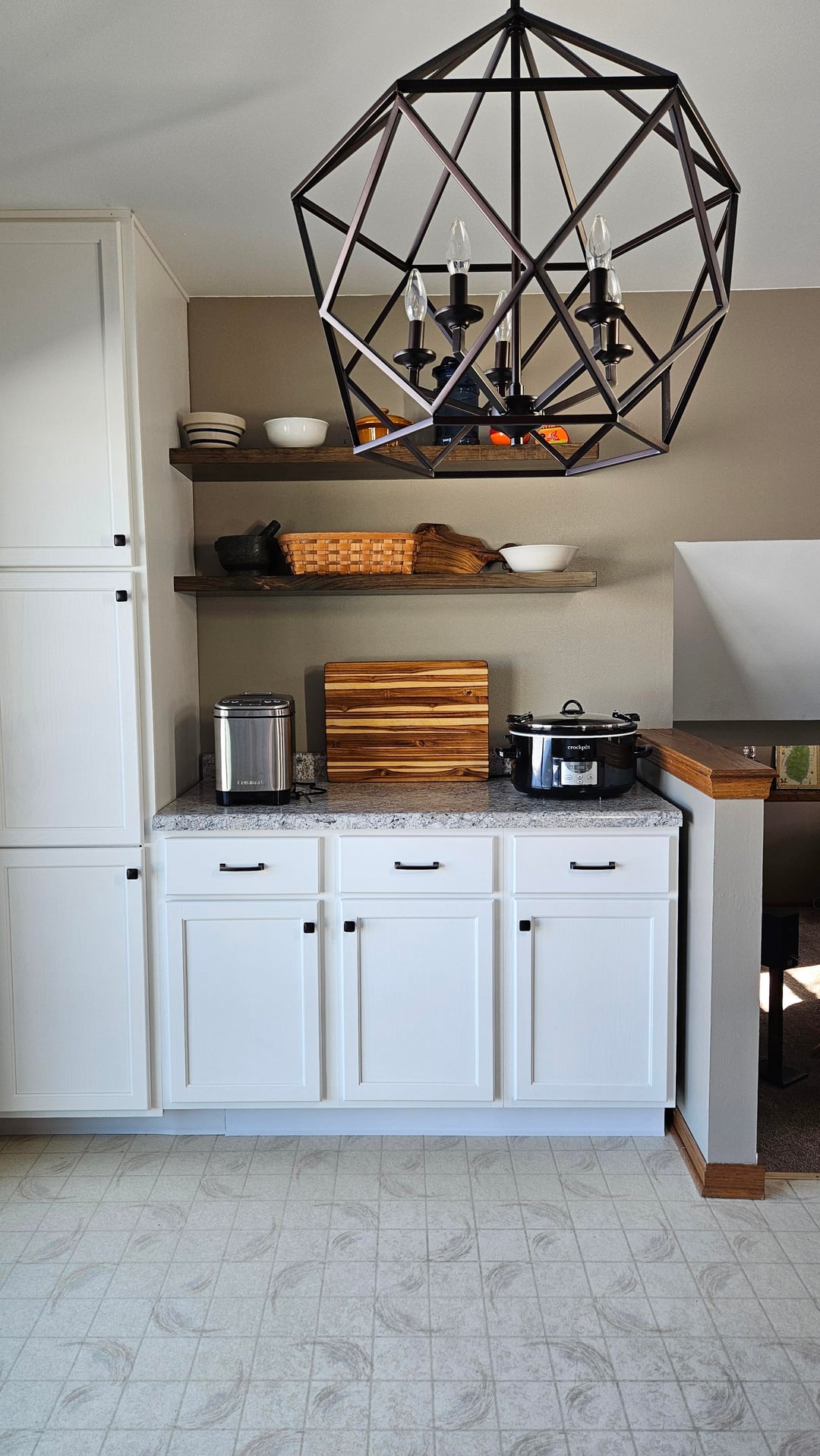 Mounted these floating shelves adjacent to the pantry. When shelves and counter were empty, something about the shelf placement felt off. Upon filling the space (using random items placed as visuals) it seems better, but I'm still not sold.