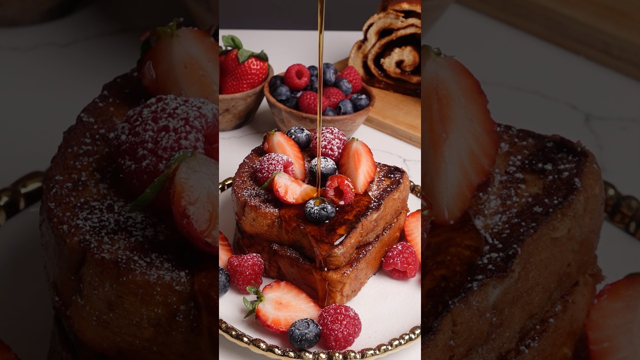 Made with a simple custard, fried in butter + a little oil for a golden crunchy finish, then topped with berries, whipped cream, and maple syrup — the best French toast ever!