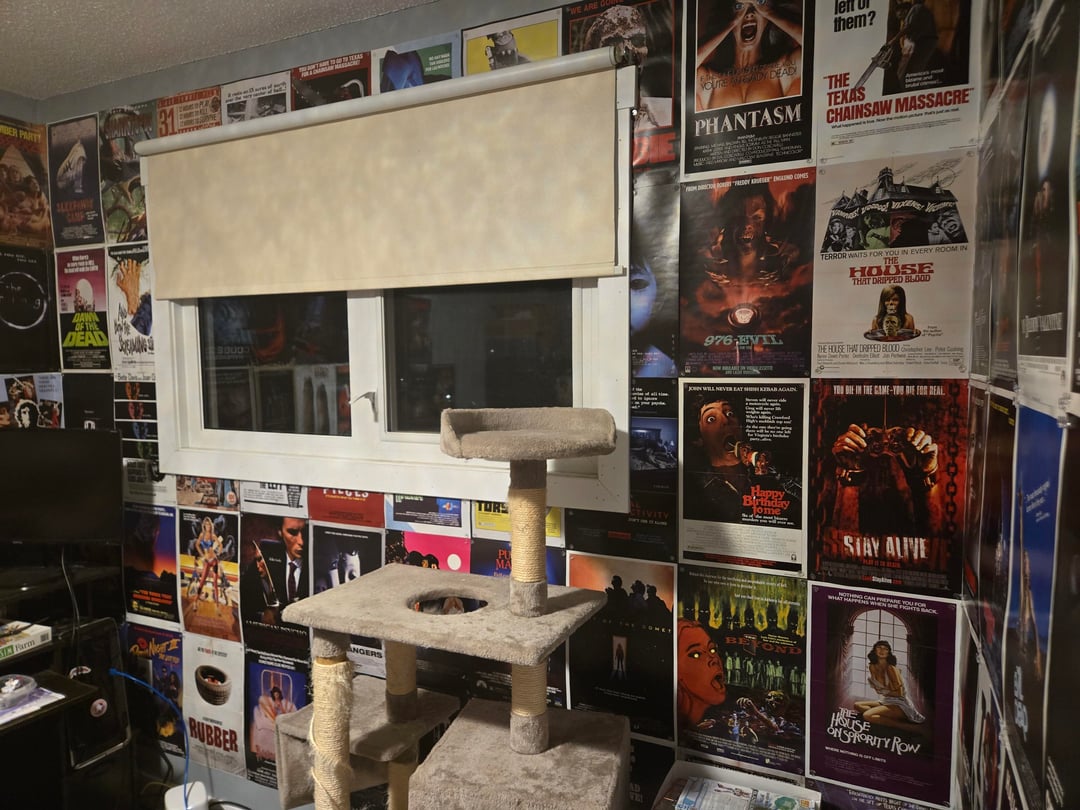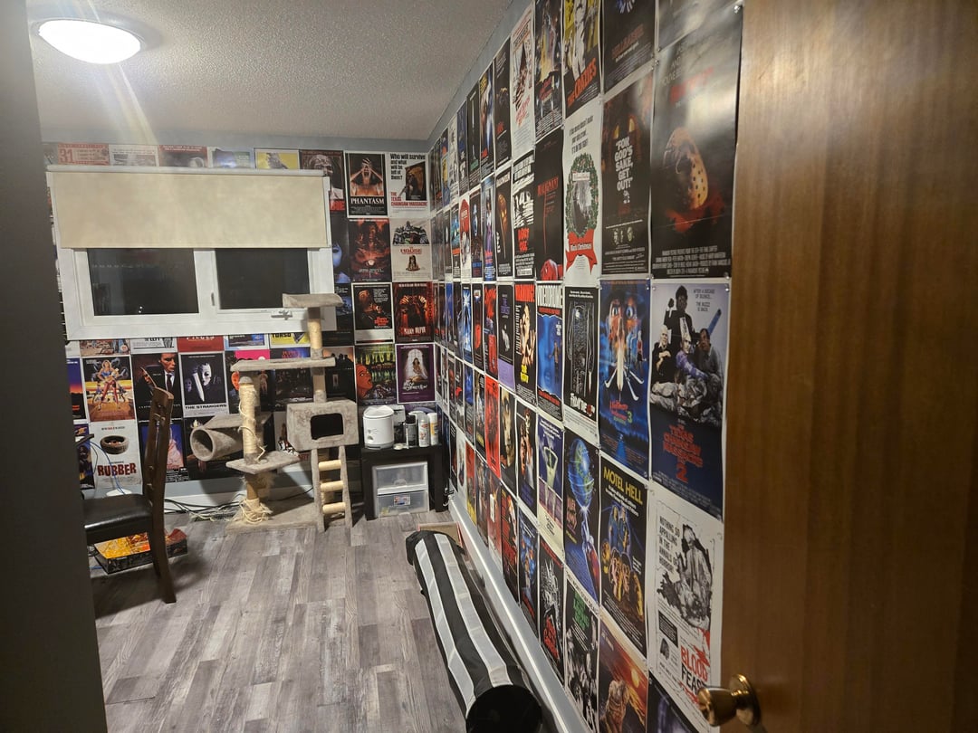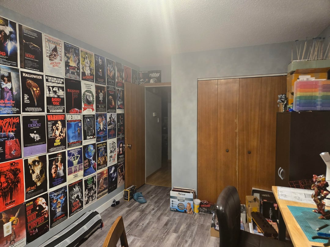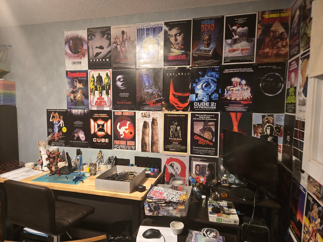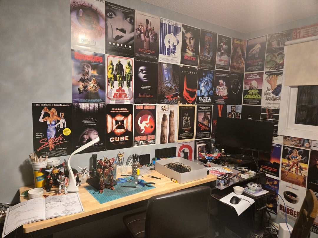 Just upgraded to a new workbench! Going to be building some shelves above it soon, probably. Posters are a work in progress! Considering filling the blank areas below and above the posters with another poster cut in half so its almost like its wrapping around. Am I cooking something here or is that gonna make it look worse?