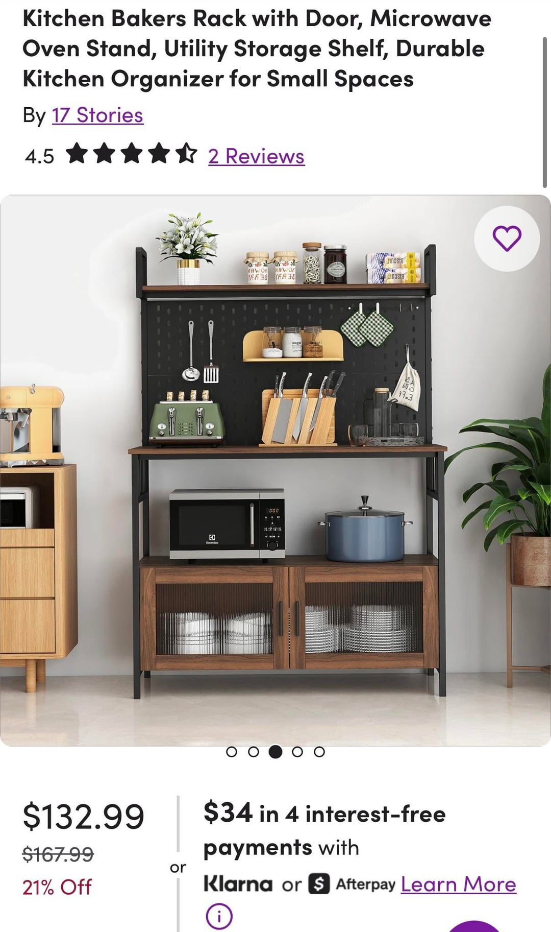 1. Having a microwave on a low shelf like in the 2nd would be really annoying, and closed storage is always nice to have. I would like to recommend that you keep the current wooden shelf, and reuse it elsewhere though. (I understand and support that you need something else in the kitchen for better storage. I just think you’d regret getting rid of a perfectly functional wooden shelf like that long term. Maybe move it to a bedroom or living room for extra storage.) Neither product is going to be as sturdy long term as what you have currently, which appears to be actual wood.