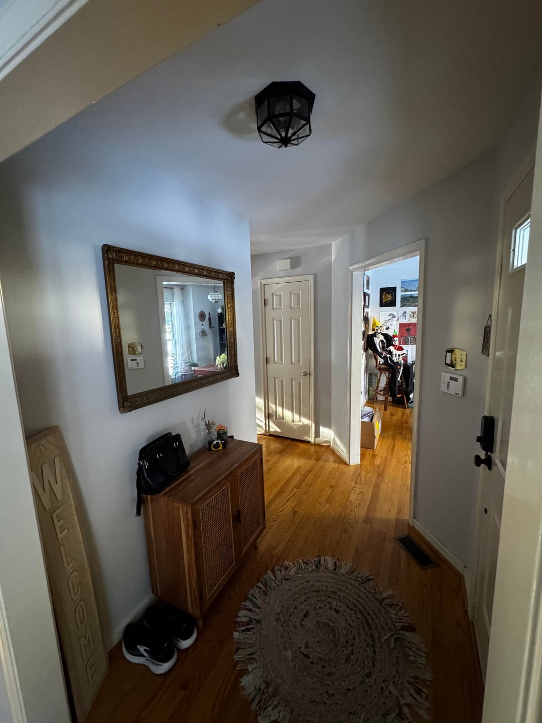 While i’m of the opinion you should do what you want with your home, in this case i will side with the husband. Stripes look good in the inspo pic because of the fairly even straight corridor with what looks like evenly spaced doors. This plays with the symmetry of the hallway – and symmetry is something which yours just doesn’t have.