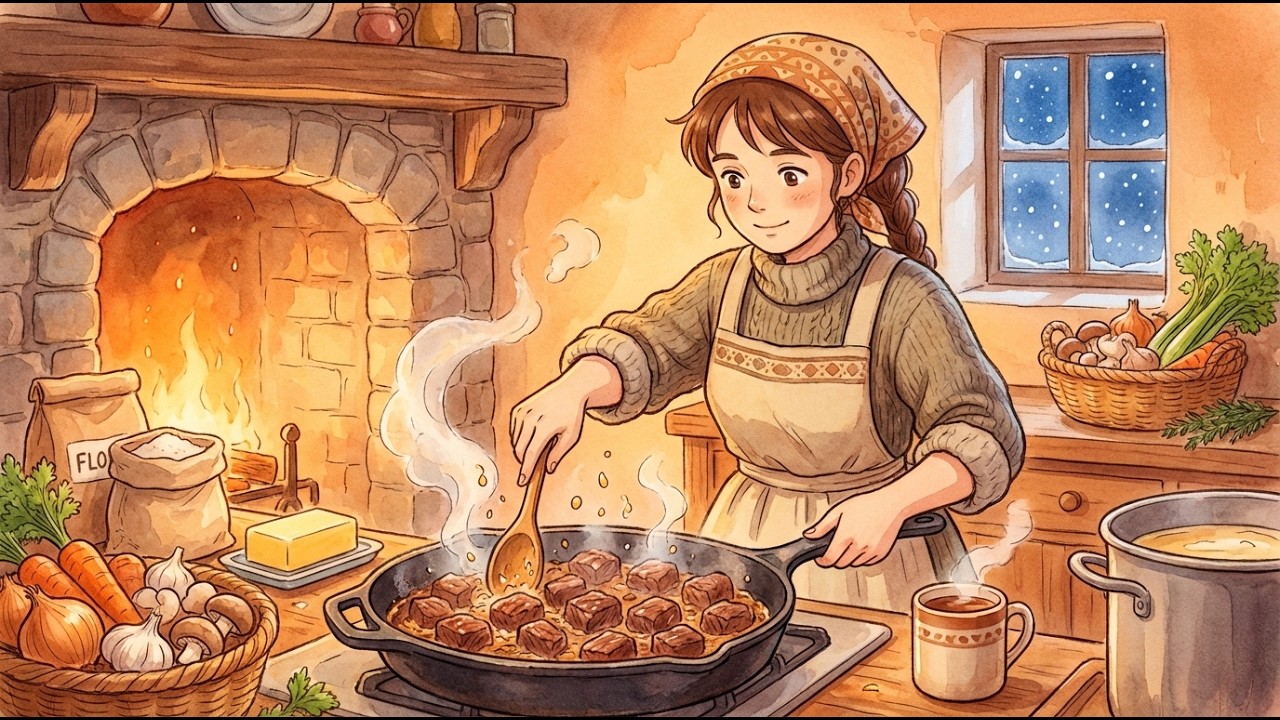Keywords: beef bourguignon, french cooking, cozy winter vibes, asmr cooking, cooking anime, ghibli style food, relaxing cooking sounds, no talking asmr, sleep aid, study ambiance, cottagecore aesthetic, slow living, aesthetic cooking, beef stew recipe, winter comfort food, animation, 2D animation, watercolor art, satisfying food, culinary asmr, snowy night ambiance, fireplace sounds, french cuisine, yakutsk channel, traditional cooking, comfort food, visual asmr, soothing video, anime food, slice of life