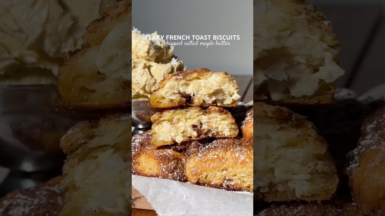 the best of both worlds in one breakfast?!! yes pleaseee 😌 soft and fluffy on the inside, incredibly flaky and buttery, and bake up with a beautifully golden exterior ✨ each biscuit has little pockets of cinnamon sugar swirled throughout and is brushed with a maple egg wash, giving you that classic french toast flavor in every bite 🤌 served warm straight from the oven with a generous amount of the fluffiest whipped salted maple butter and a hot cup of coffee — they’re warm, cozy, and truly everything you need for a winter morning ☕️