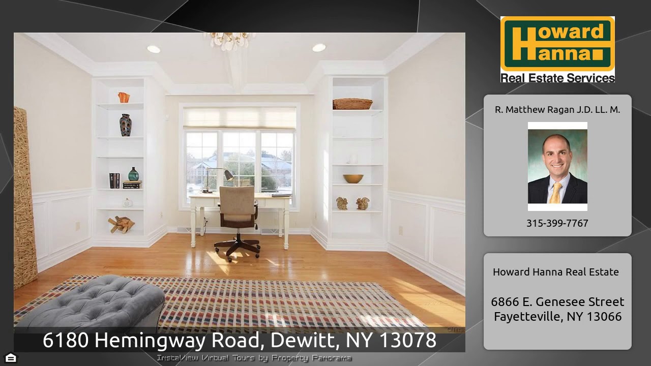The Virtual Tour for the property at 6180 Hemingway Road, Dewitt, NY 13078 listed for $624,900: Other homes for sale by R. Matthew Ragan J.D. LL. M. of Howard Hanna Real Estate: Best of the best! Relax everything but your expectations in this fabulous home and neighborhood with HOA that covers lawn care & snow removal. This custom pristine ranch boasts attention to detail throughout. Stunning hearth warmed great room with vaulted ceiling and formal dining area, magnificent state-of-the-art gourmet kitchen with French doors that open to Florida room, study with built-ins, bonus room with …