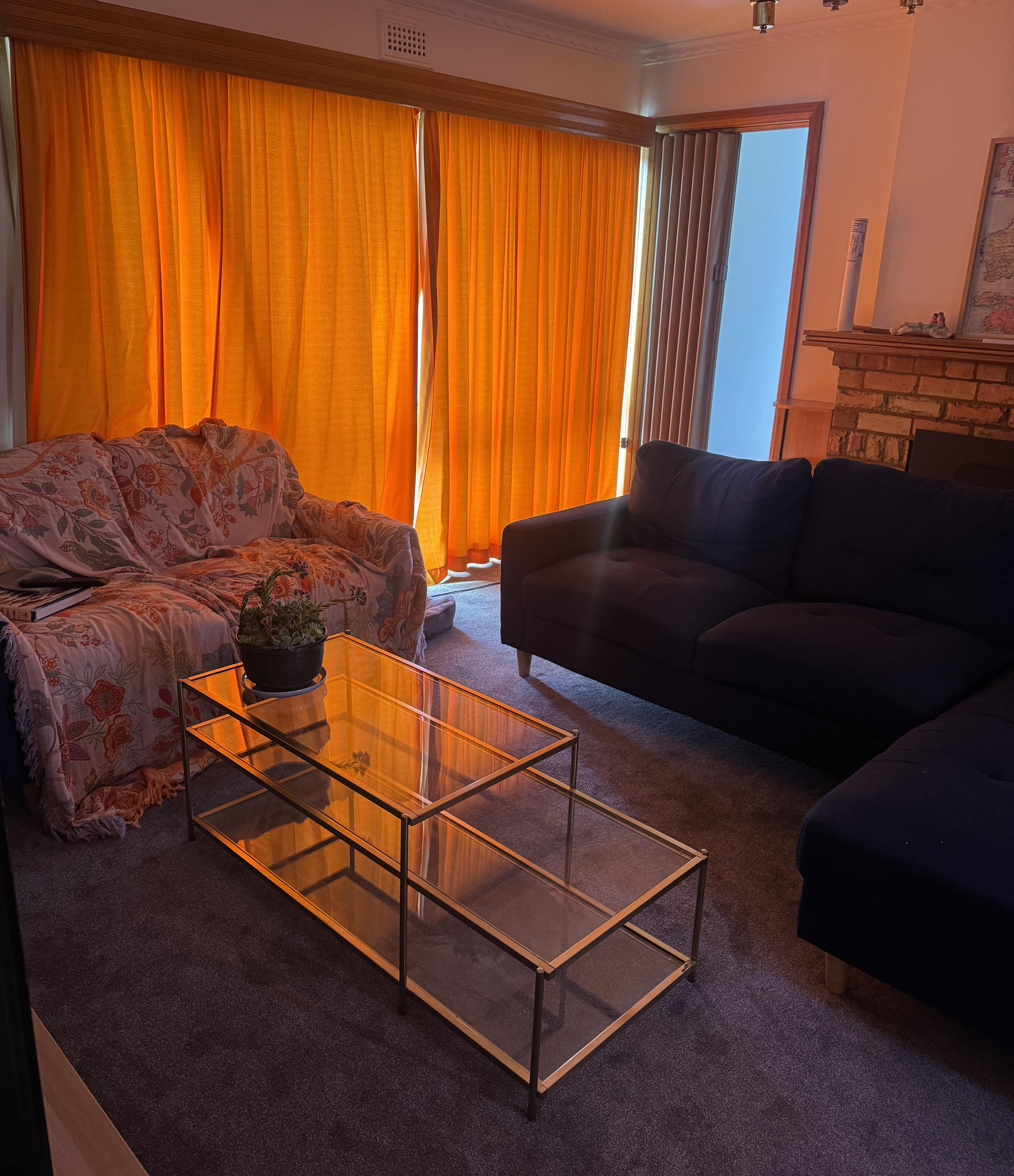 Have recently moved into a mid century – 70s era home. Orange curtains came with the house, so we’ve bought furniture from marketplace to complement them. Stuck on what else to add to this room that won’t take away from the contrast currently? Thinking of removing the blanket off the left sofa as well.