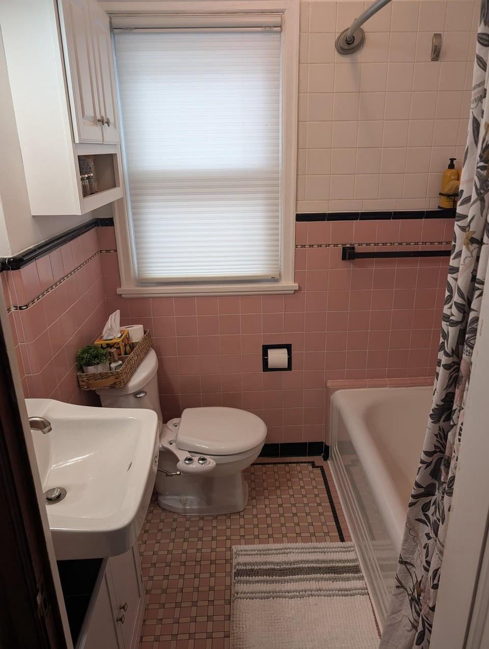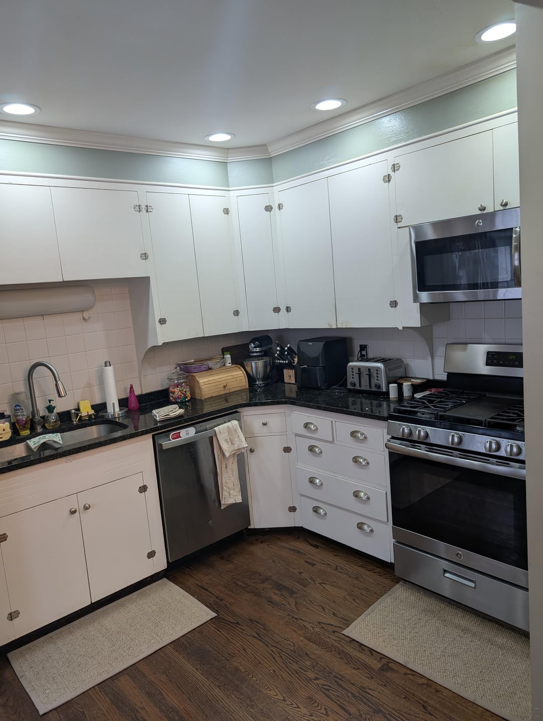 I like the green/brown/warm toned furniture and rooms, and those seem to be the most standout areas (in a good way) in your home. Ideally what I’d do is to swap bathroom and kitchen cabinet (maybe counter) colours to match those tones, swap out the dining chairs, and then get warmer lighting and/or less overhead lighting in the dining room and kitchen