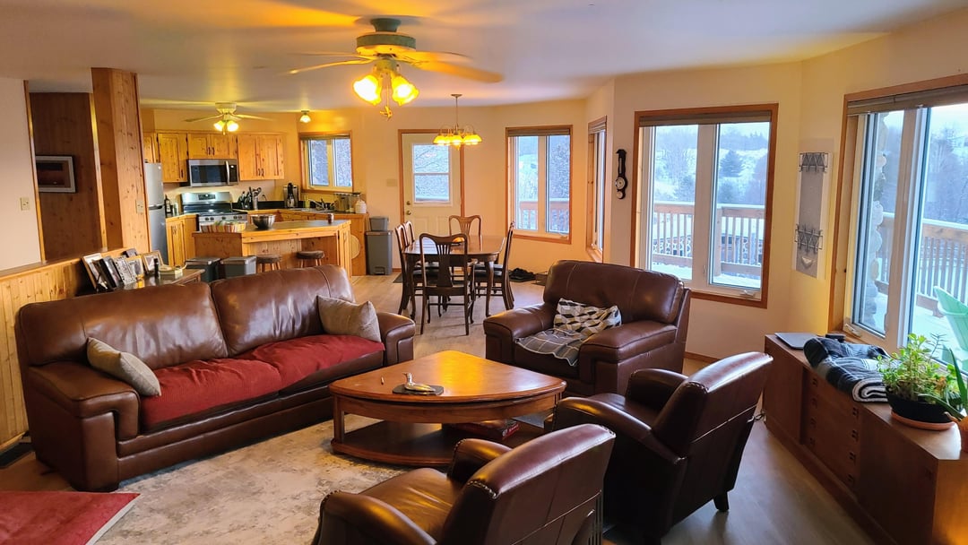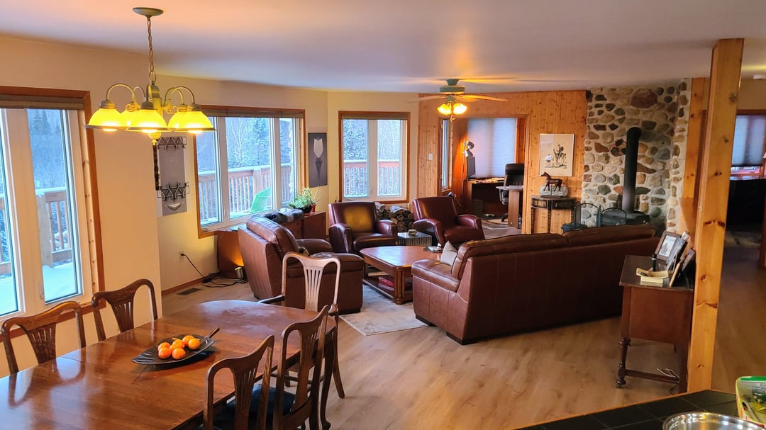 This open concept house is due for a repaint. Current wall color is yellow tone. The kitchen walls are an unfortunate coral that is a little too close to pink. The riverstone fireplace and pine cupboards (and accent walls) are begging for better complimentary colors. Because the view is forrest and lake my instinct was green tones but that may be too "on-the-nose". Ash greys may work? I'm open to a more challenging color pallette. Any thoughts to share?