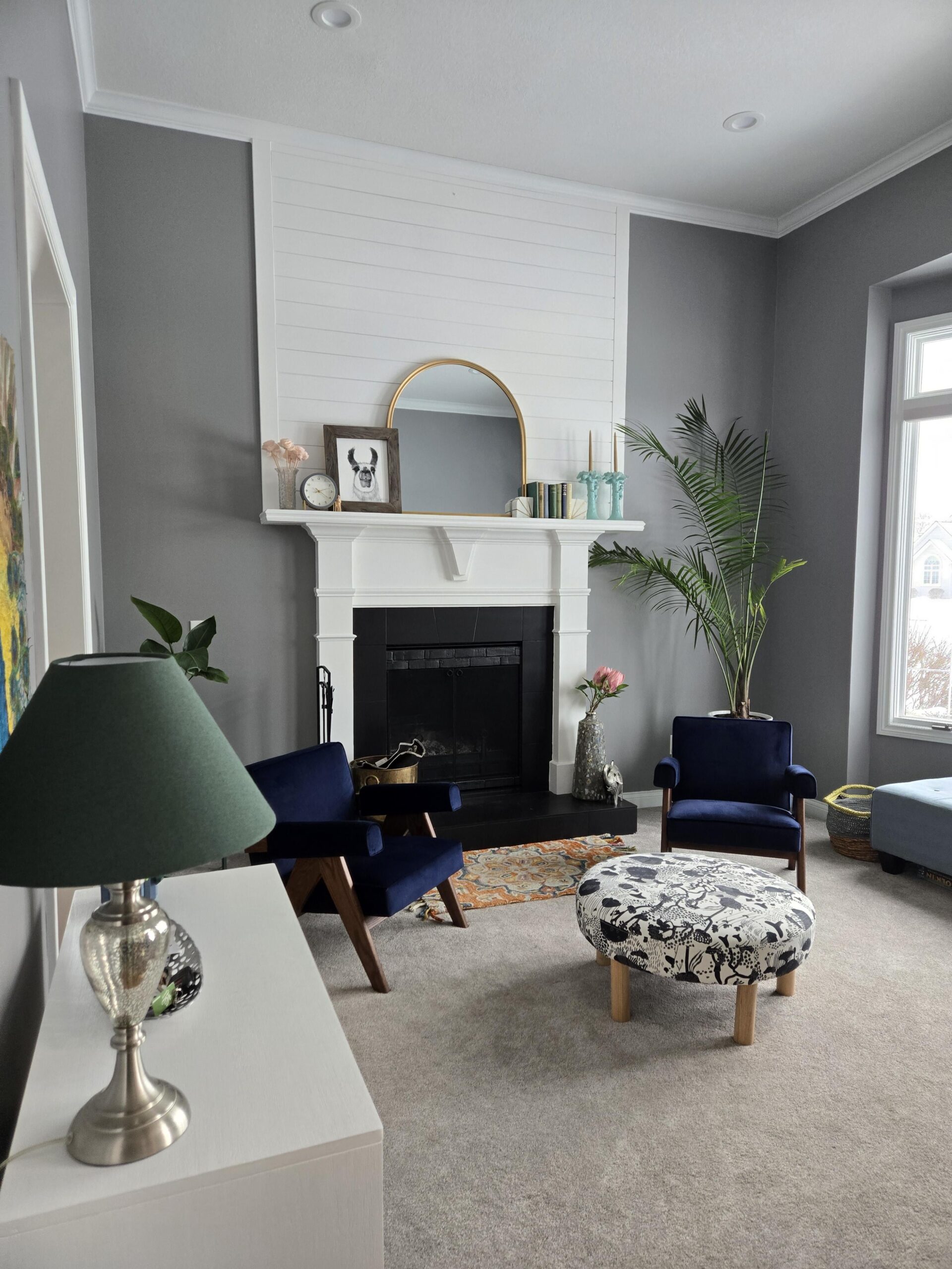 I need help picking out a small, 100% wool hearth rug for this room. The current rug coordinated with the fireplace at our old house and looks very out of place in the new one. I'm thinking a green, maybe? But I'm open to other ideas!