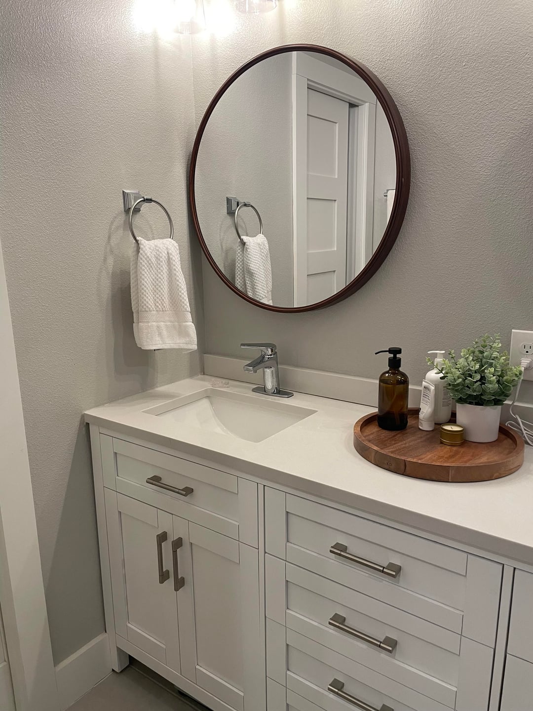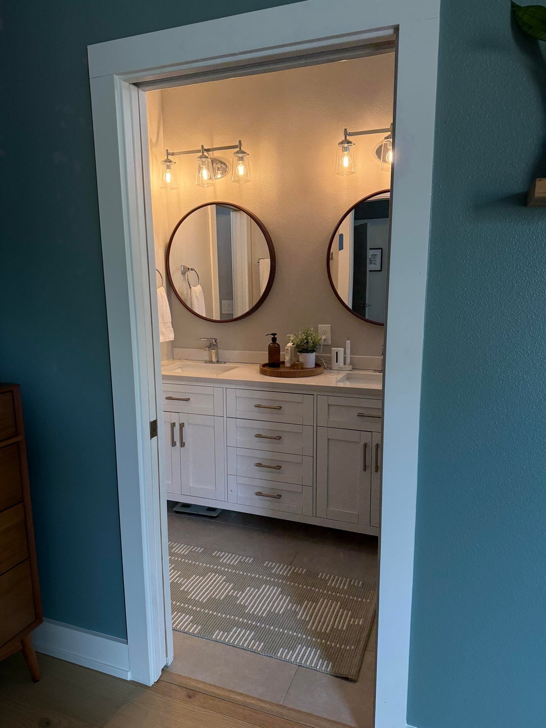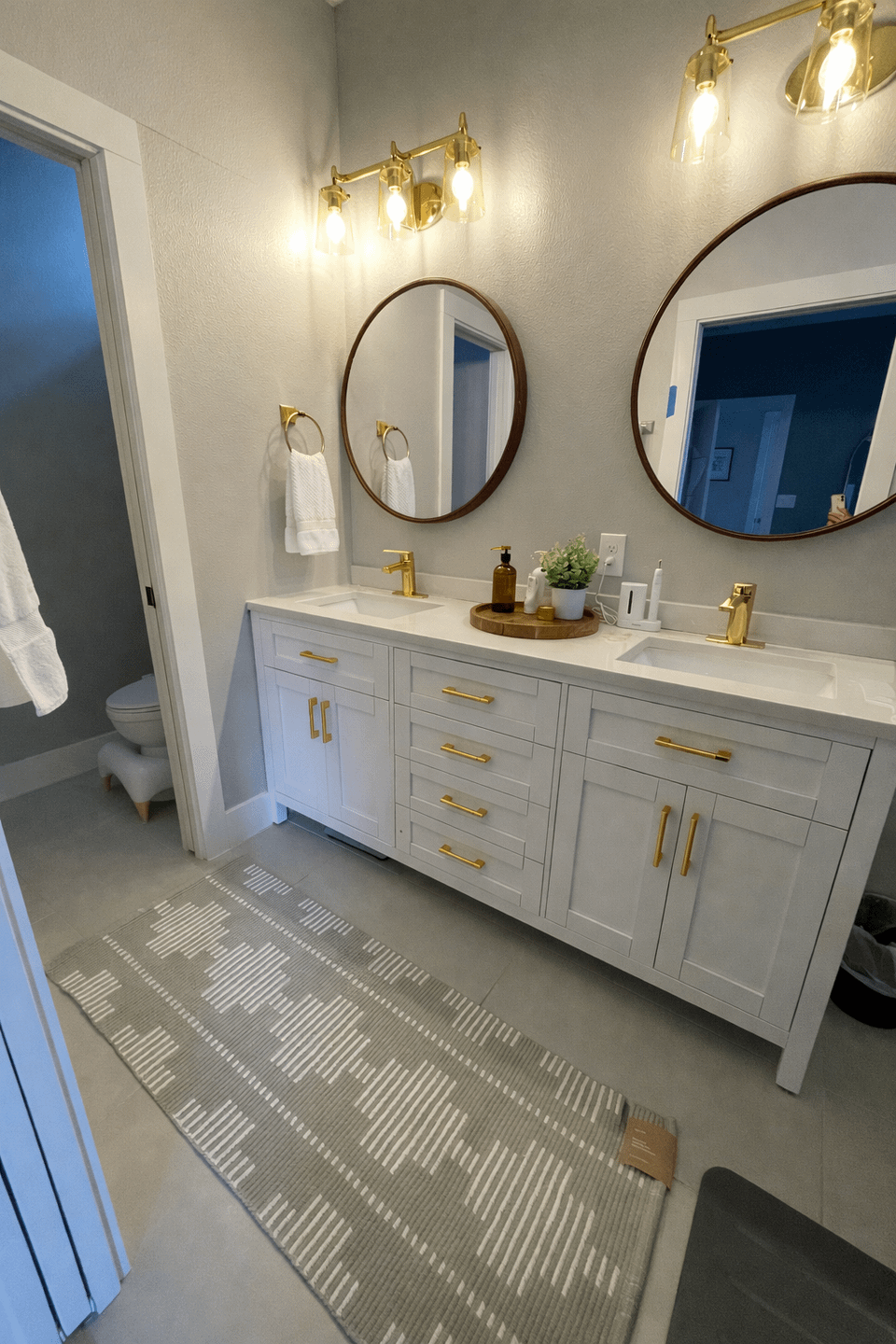 • Switching out hardware for brushed gold (towel holders, faucets, pulls, lights)