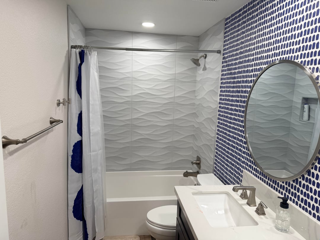 Short of changing it to something else, what would you do to make it fit better here? What can I do with art/towels/shower curtain/mirror to make it more cohesive? The vanity is navy and I thought this would tie it in….