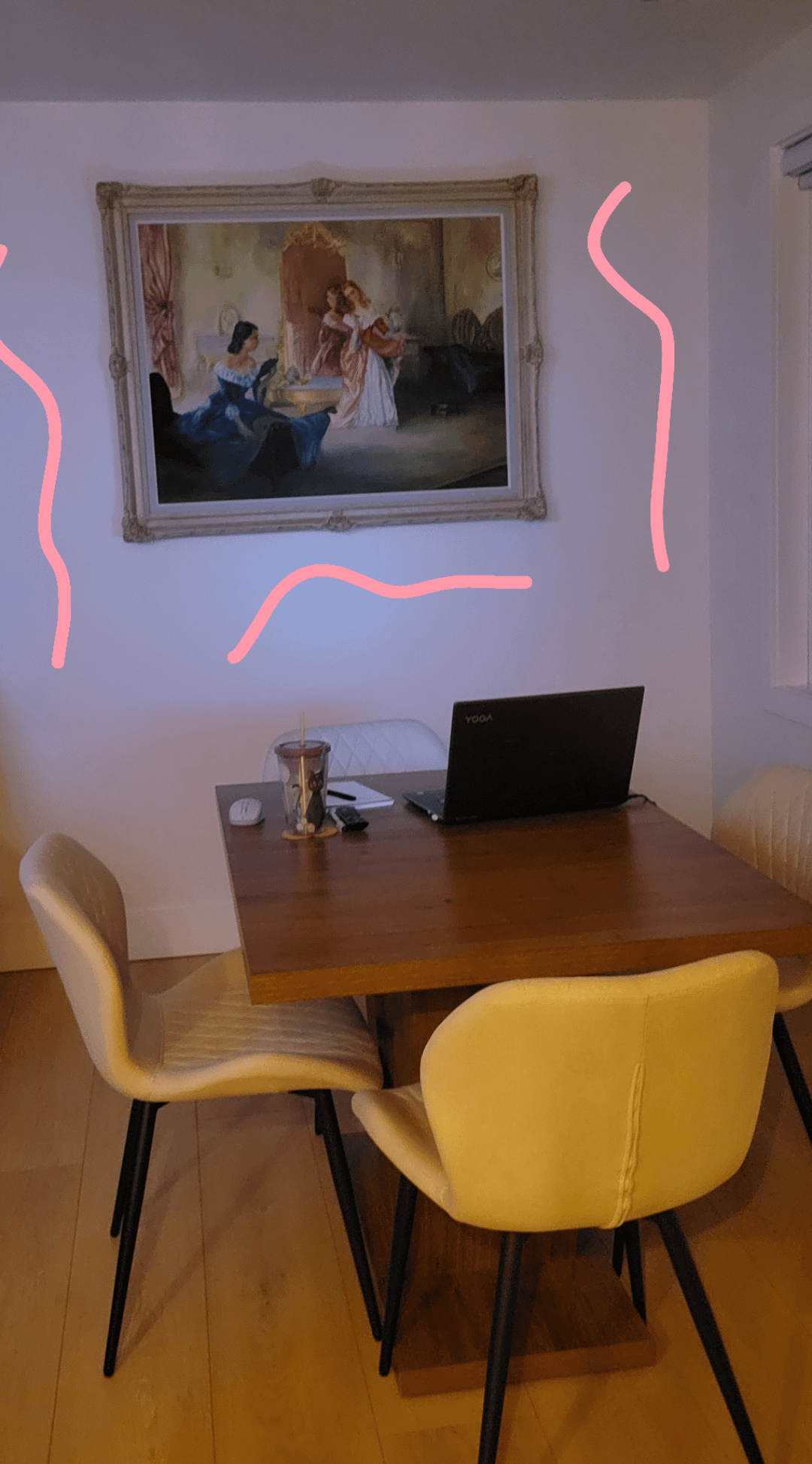 Sconces, with crystal drops on each side of the painting. To me the color of the chairs feels “space age” Can you get some pink frilly seat covers? Or swap the chairs for curvy Queen Anne to complement the painting?