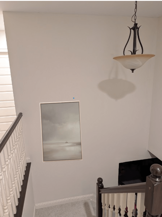 Any ideas what I could do here? I found a painting that I really like, but not sure it fits. Does the size look OK? Its 36×24. How should I place it on this wall? Like I have it photoshopped above? More centered on the entire wall? Or centered more in line with the landing itself?