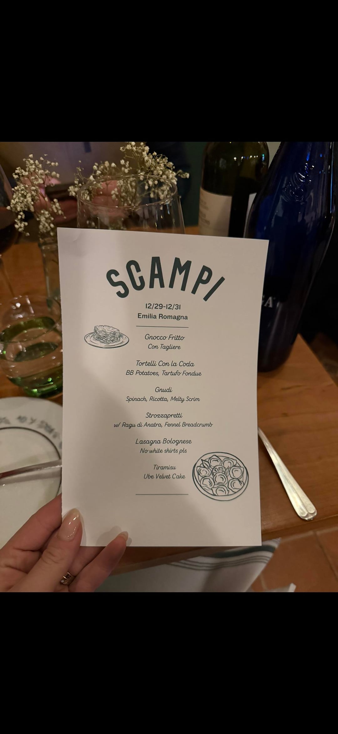 So I’m presuming it’s the Scampi in Philadelpia restaurant, they say they are BYOB, so did you bring it in? Or did you buy it from the restaurant? In which case try to send an email with the photo and see if they can help you out. The white label and golden text on the neck should be recognisable if they keep tabs on what that restaurant sold around NYE