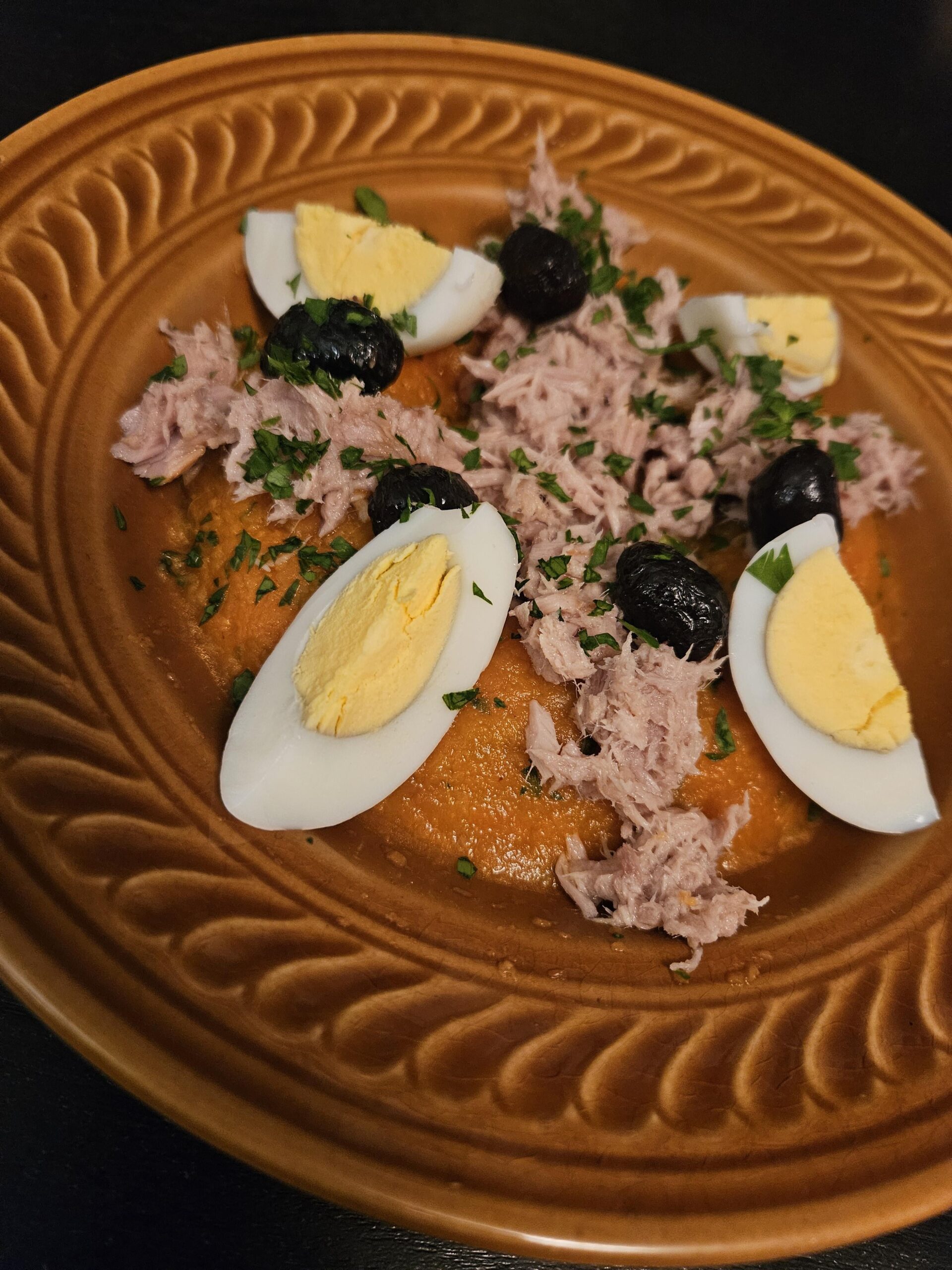 Là comme ça, on dirait des oeufs durs trop cuits, du thon en boîte et des olives de base avec 3 brins d’herbes… mais je ne regarde pas Top Chef.