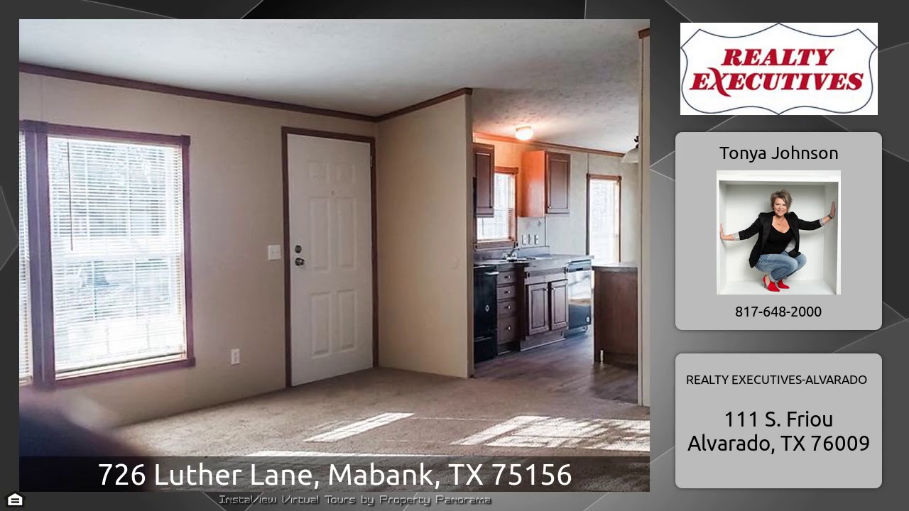 The Virtual Tour for the property at 726 Luther Lane, Mabank, TX 75156 listed for $119,900: Other homes for sale by Tonya Johnson of REALTY EXECUTIVES-ALVARADO: COME SEE!! Completely updated home! Like new! 3 bedroom 2 bath on clise to 2 acres! This home has a huge master bathroom! The walk in shower has separate vanity, garden tub, nice size closet. Nice kitchen with tons of cabinets, extra counter space with island, Updates include: flooring, paint and texture inside, new carpet, and flooring through out. My favorite part of this home is the 12 lite french doors in the dining room …