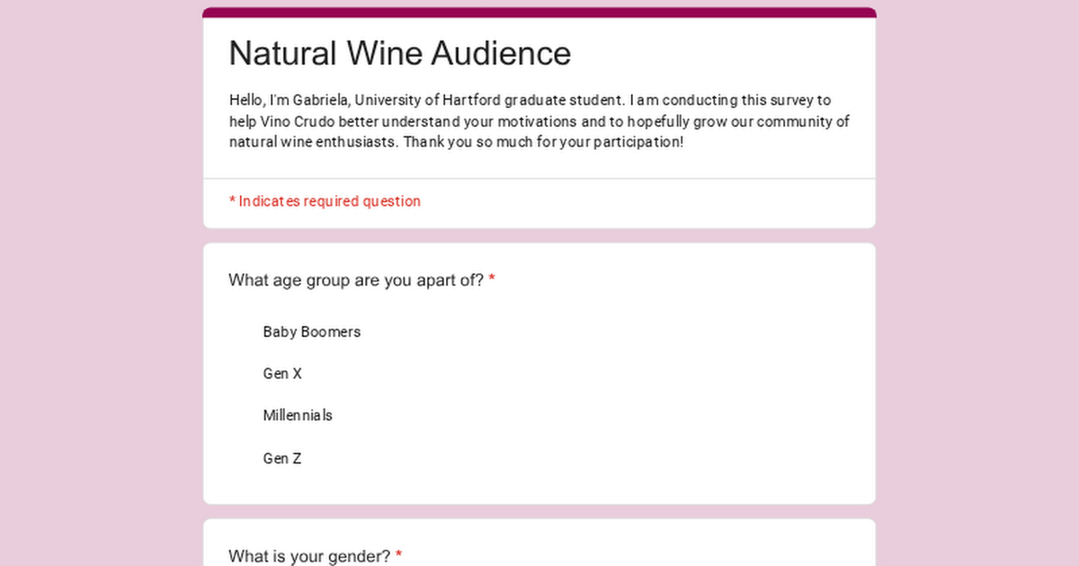 I'm a graduate student doing research for a local wine shop. I'm trying to identify who the audience is, how they behave and what would attract them to shop more often at a small shop. If you'd like to fill it out, I'd really appreciate it. Thank you in advance!