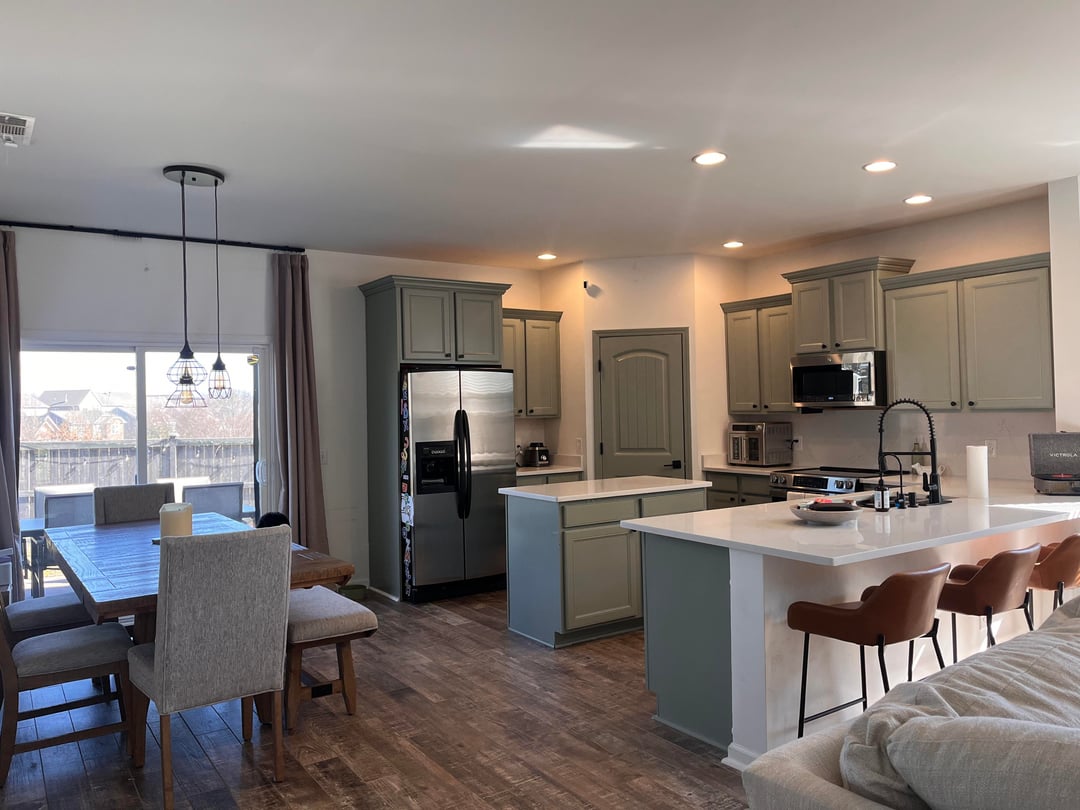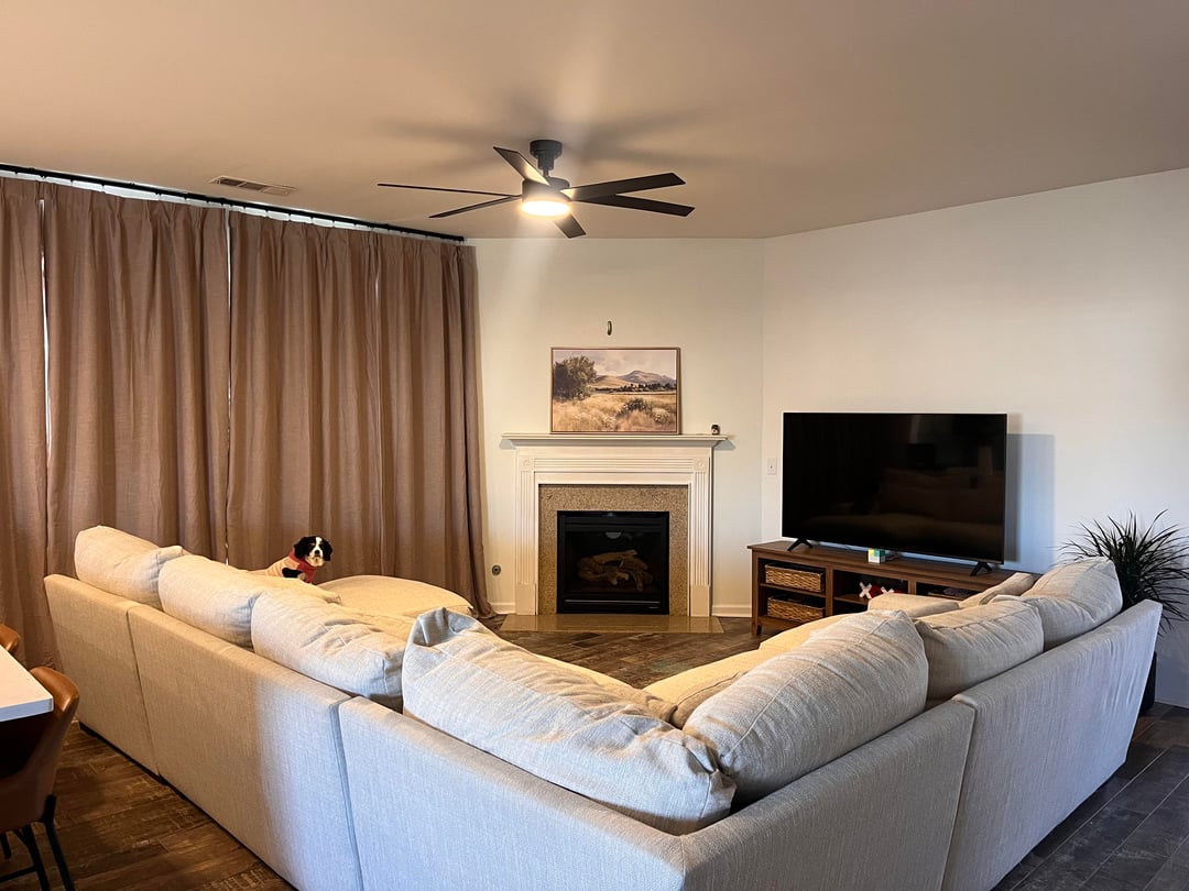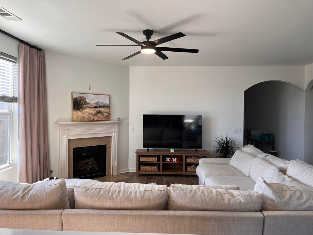 Currently my focus is on the fireplace. I’m stuck with this corner builder grade fireplace so what can I do to improve it on a budget? Long term I want to do stone from the floor to ceiling but it’s too expensive at the moment. So I’m torn between painting the mantel and the marble or painting the mantel and doing peel and stick tiles on the marble. I’d love to remove the mantel and marble but my concern is that the marble on the floor has to stay because there’s no tile under it. My husband agreed we could paint it today or tomorrow before people come over for the game on Sunday so I need help deciding what color to do. My other thought was remove the mantel and do the shiplap board and paint the marble.