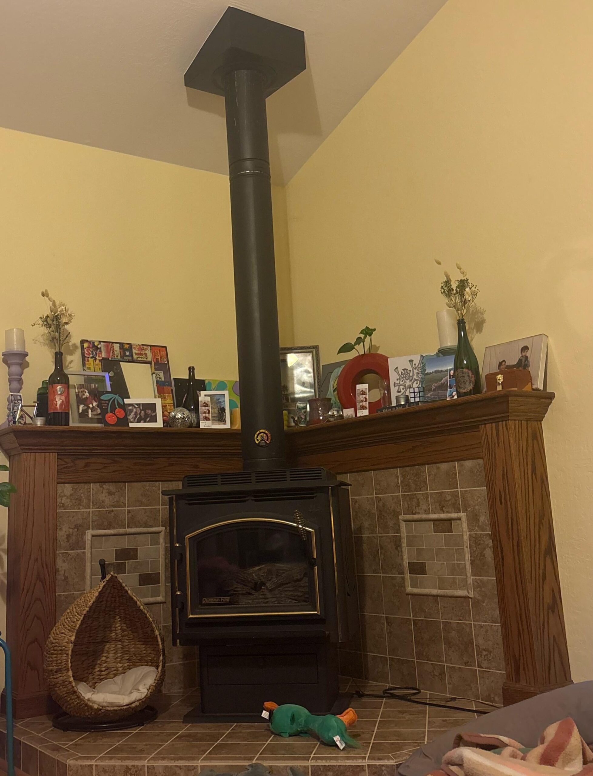 It depends on what your style is and how much you use the wood burning stove. They are great if you use them, but other styles of fireplaces are more appealing design-wise. You might consider closing it in with a hearth type structure (brick or rock). This will be easier to style and you can still have a mantel.