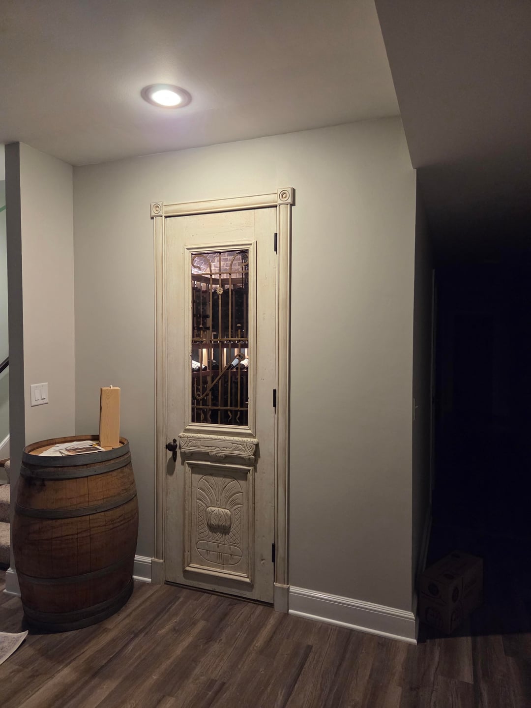 My vision was an old world chateaux cellar. With the right pieces, and a bit of old artist trickery, it turned out better than even I expected. An antique wooden door from Egypt, rehabbed, widened, and fitted with double planed glass. An antique Spanish iron sconce found on Marketplace an hour away, plastic brick wall stickers stained with an antique glaze, and a lot of poplar boards and days of cutting/finishing.