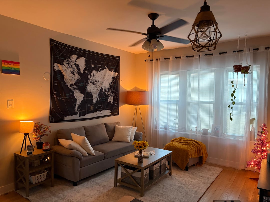 Anywho, rant aside, now that I don’t feel like the lamp was forced upon me I kinda like the aesthetic. I like how it isn’t too similar to the table lamp, contrasts in size and color and kinda anchors the couch in a different way. I also like that it adds more color, character and warmth to the room. It is bigger in person and I don’t like moving it too much- hence, the pictures from different times and lighting (I accidentally nipped the big lamp w the ceiling fan when moving it 😭).