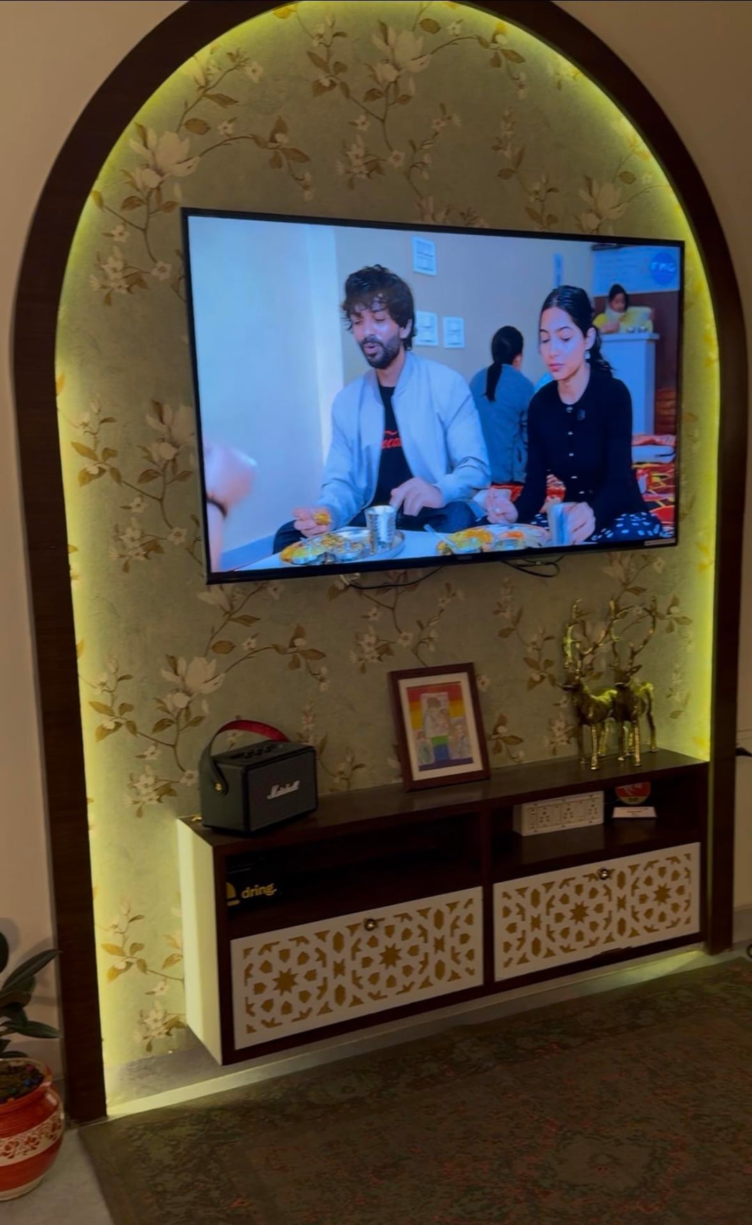 My old TV Unit was my own design and was created on a stringent budget just for the sake of it. We recently moved into our new space and I wanted something that spoke and represented my personality. I went back to the drawing board and refurbished my old TV unit to the new one, again on a tight budget. The wallpaper is embossed canvas and I got it at 1/3rd the quoted price due to supply issues. Our place screams earthy tones so wanted to keep the TV Unit along the same lines. The switchboard is bugging me because this TV unit was created after numerous trials and errors and on a short timeline.