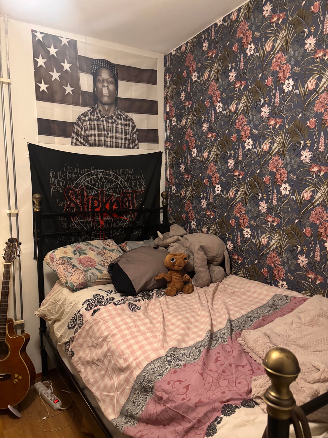It looks very cozy. I love the wall paper. You need very small nightstand where the guitar is. Just pick something someone is throwing out, paint black and attach a power strip to the back. It will get rid of the power strip mess on the floor.