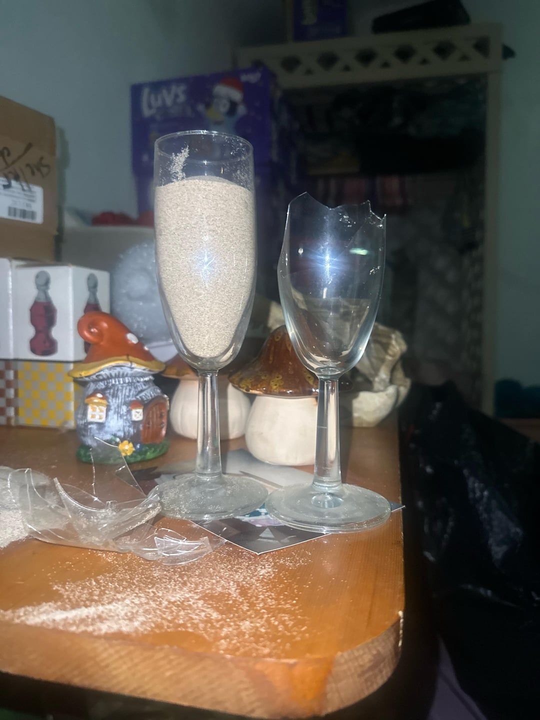 Guys, can you please help me? I am looking for an exact wine glass for my girlfriend. These wine glasses were her great grandmother’s from 2011 when they went to Michigan and the sand is from Michigan. Also, the only thing that she wants replaced is the wine glass. Please help me find an identical one please.