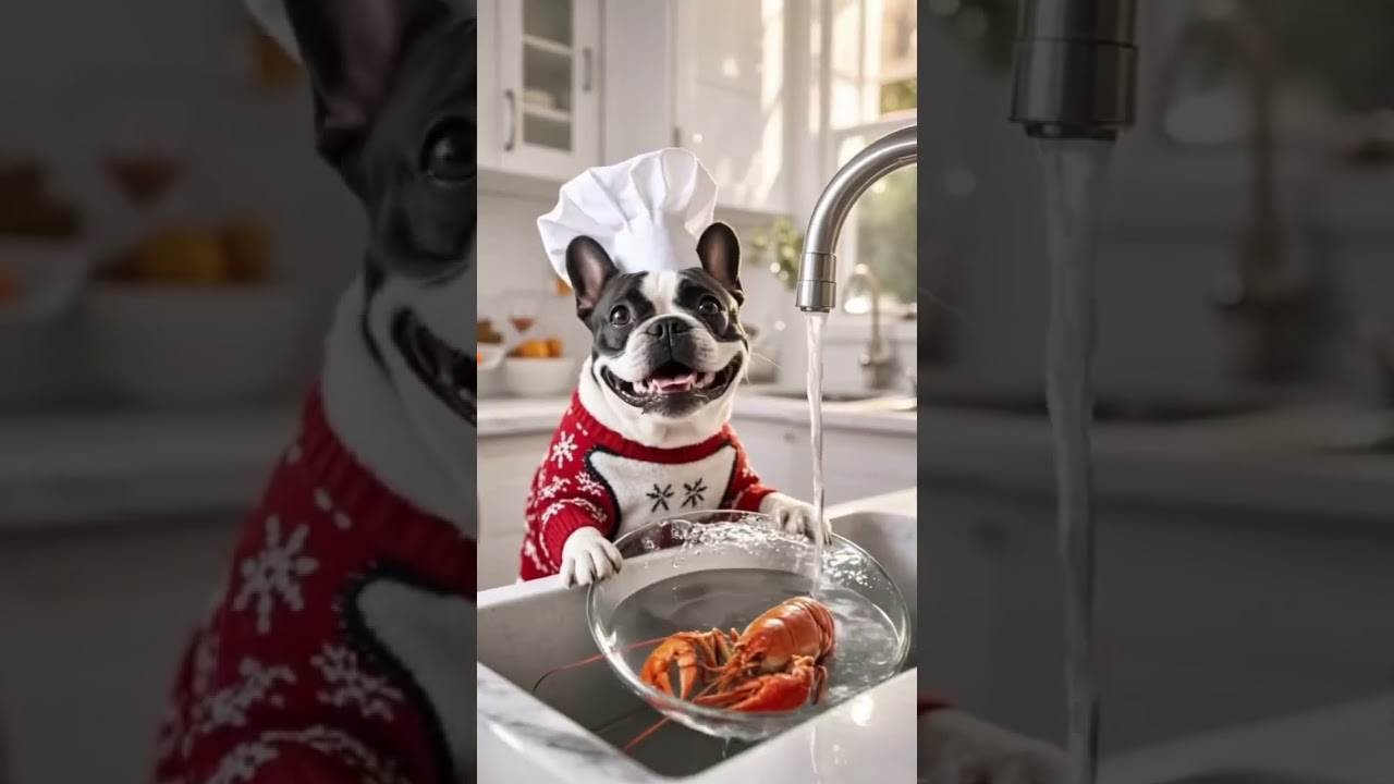 Meet the world’s most talented French Bulldog! Watch as our furry chef goes from catching a fresh lobster at the lake to preparing a gourmet feast in the kitchen, and finally enjoying a fancy holiday dinner in style. From fishing rod to dinner fork, this Frenchie does it all with style and a smile!