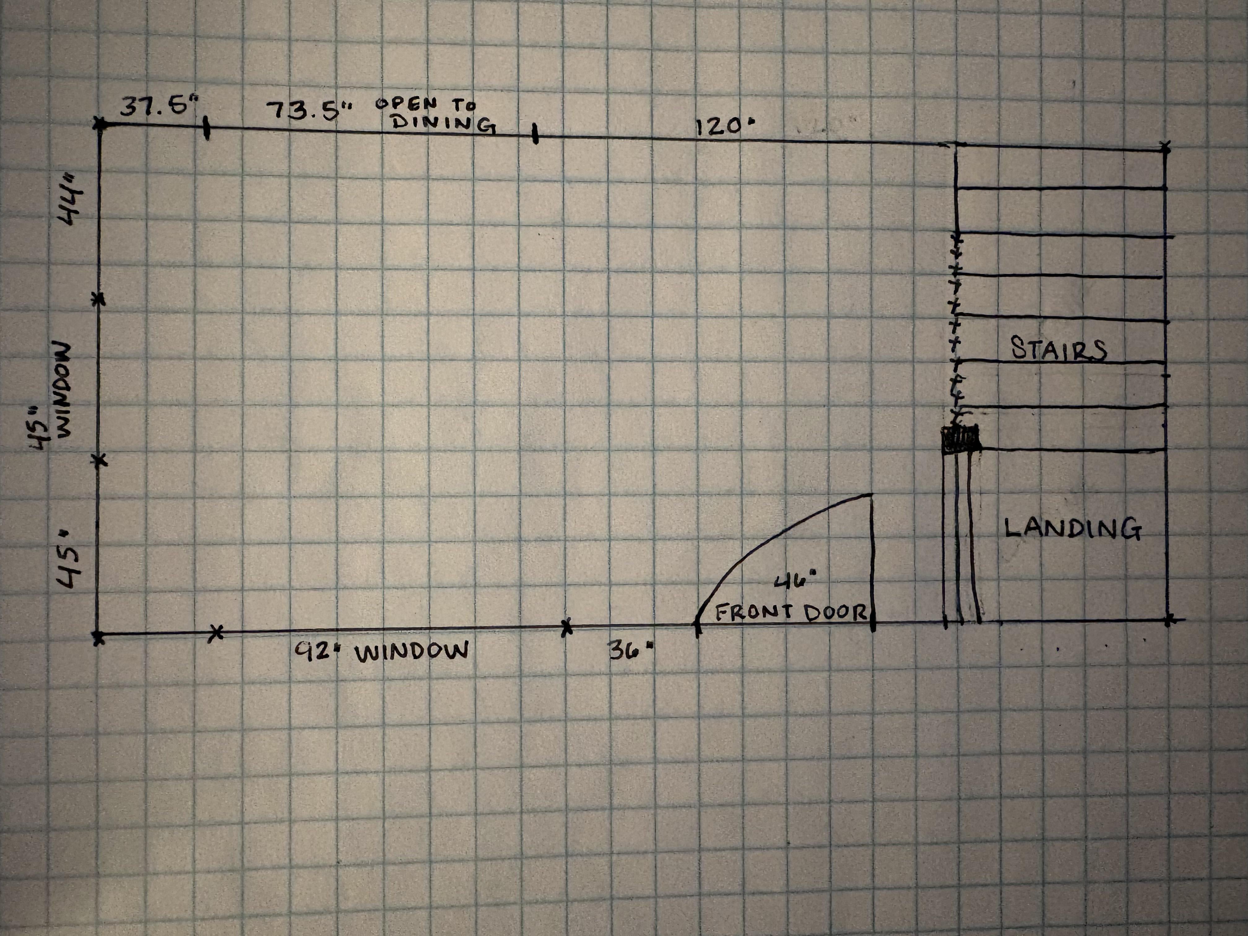 After a couple of years in our house, I’m still stuck on how best to layout our narrow living room. We’re currently using free furniture from friends, and I feel like I need to nail down an ideal layout before investing in a new couch, tv stand, etc. I’d like enough seating for 3-4 people to sit comfortably without being shoulder to shoulder on one couch. Thea front door/landing being diagonal from the dining room entry makes it difficult to find a good “flow”. I’ve even looked at listings for home similar to mine, but the layouts are overly-staged and don’t make sense for an actual home.