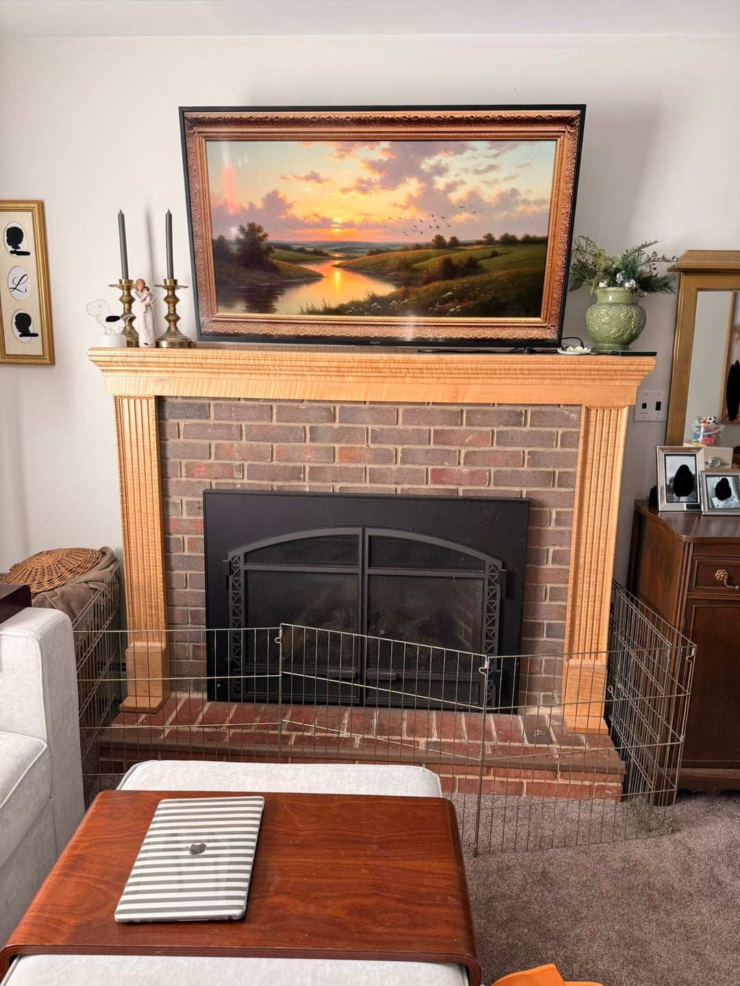 I would leave it alone for now. Is there anywhere well that the tv can go? The frame style looks awkward resting on the mantle and it’s too high up there anyway. I get keeping it out of the way for the child, but I’m thinking longer term.