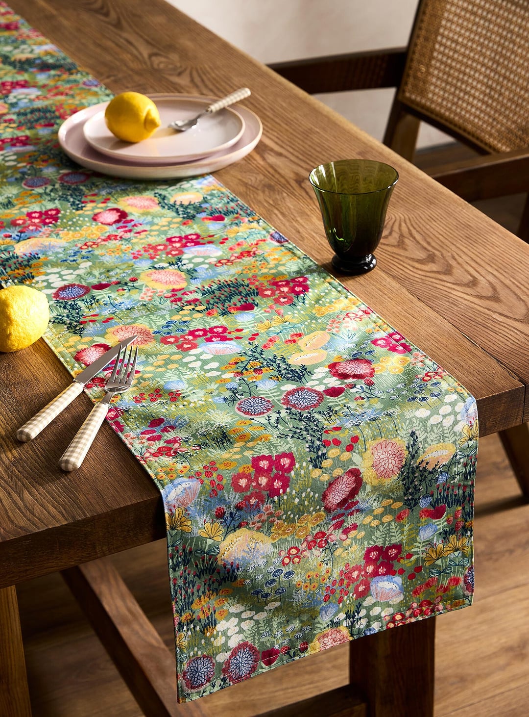 I would go for a woven runner in deeper greens and rusts, and not a floral pattern for this. More rustic would look great with the pot atop it and with the table style.
