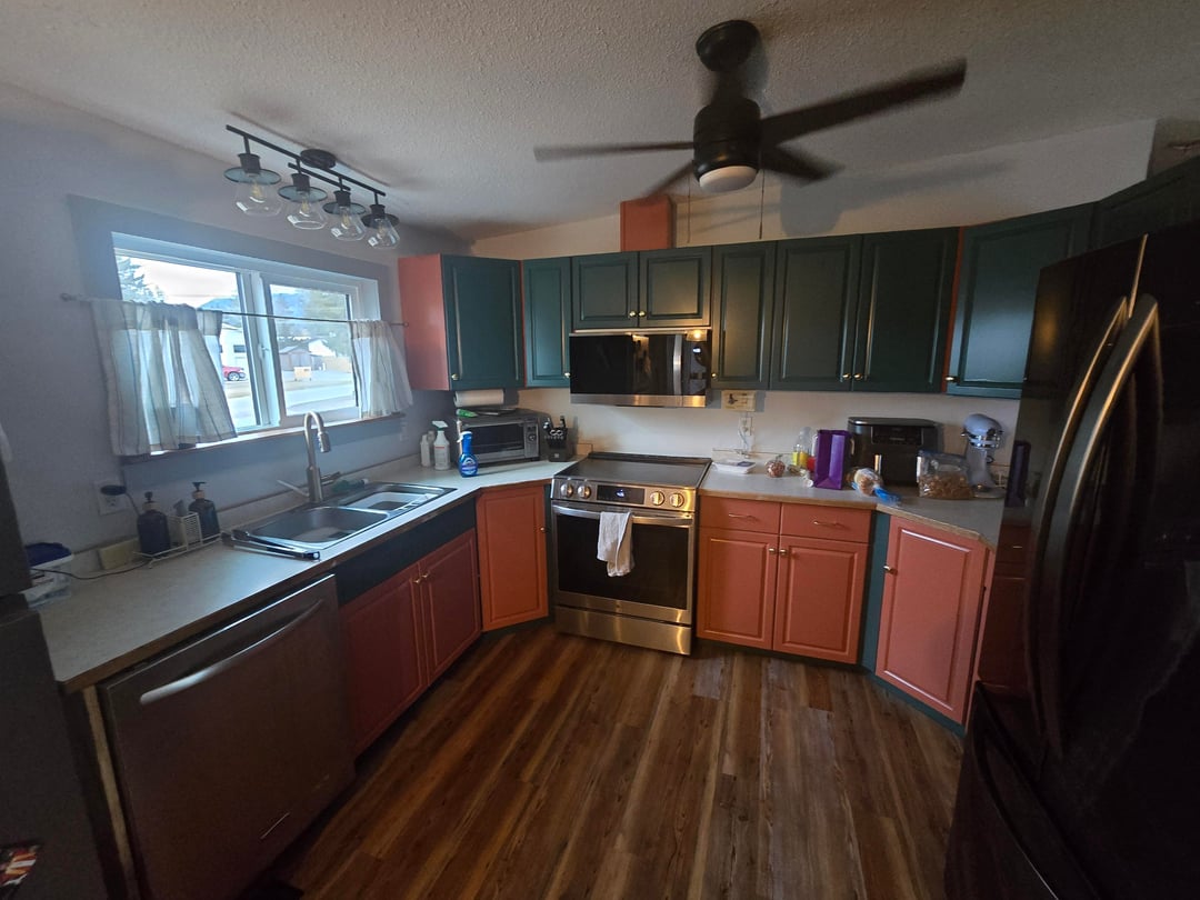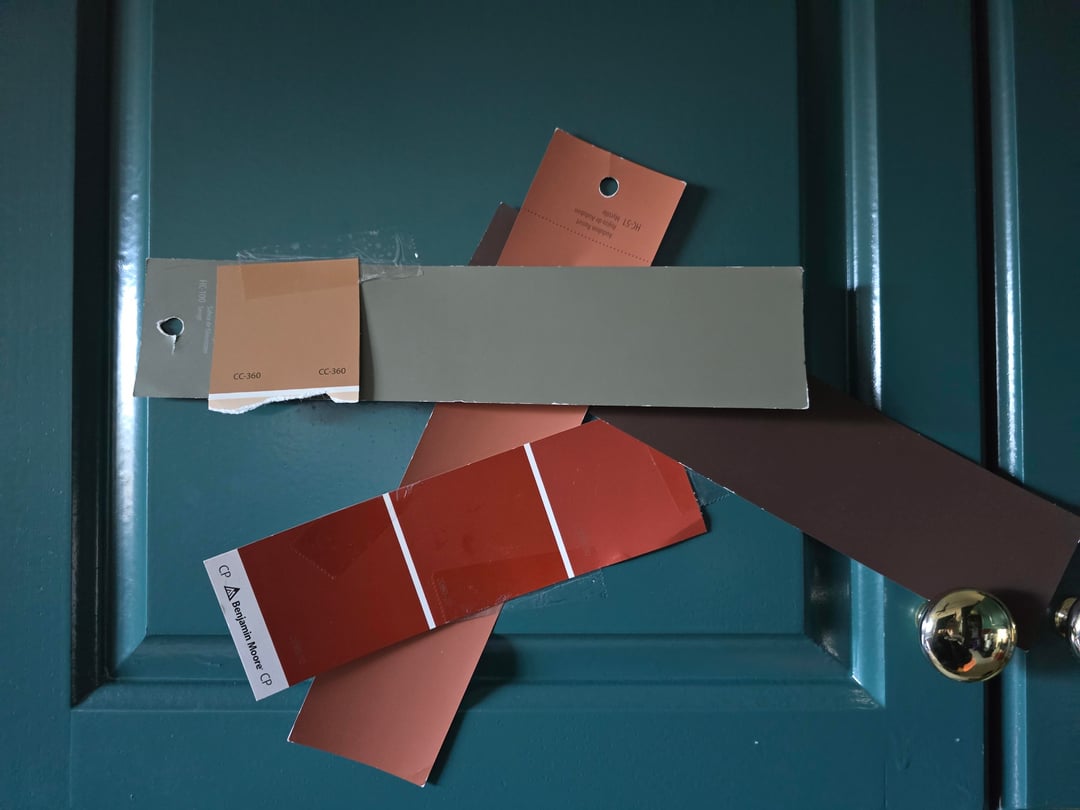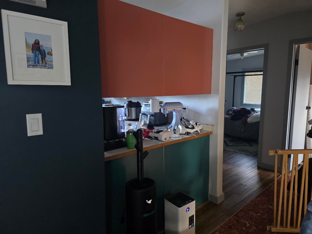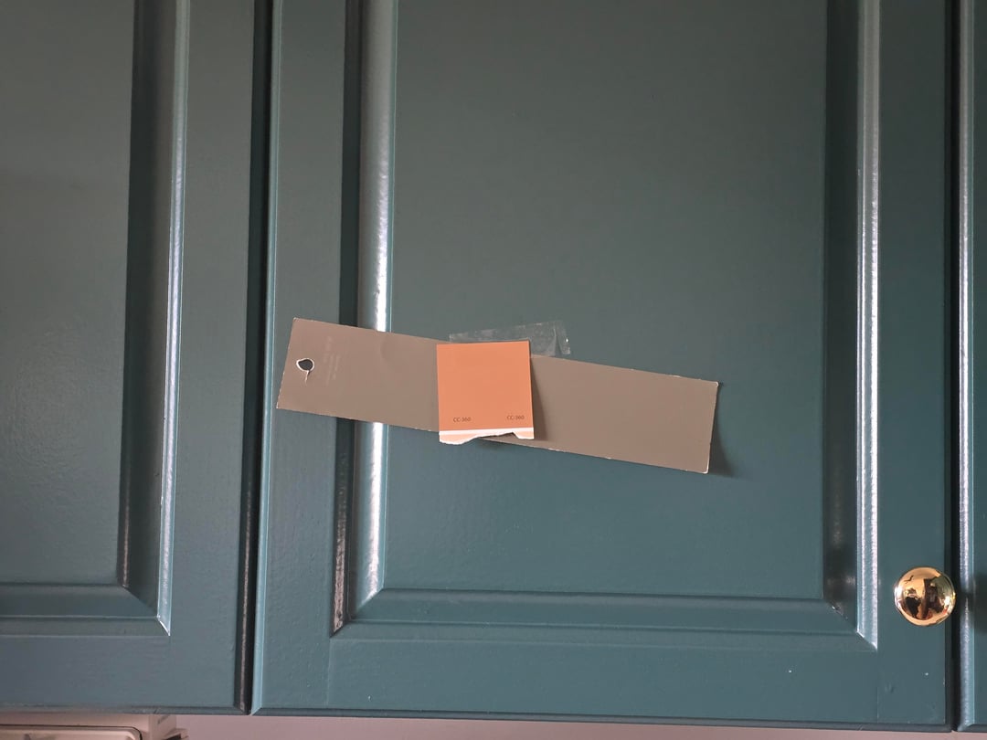 Long story short. I was inspired to paint our cabinets after seeing this resturant in Mexico. Our cabinets are crappy melamine. Life is too short for boring, so I went strong with a Teal and Terracotta. We own a painting business so when we went away last week we had our guys do it. They screwed up and did Terracotta (Terracotta Tile BM) on bottom Teal (Dragonfly bm) on top. Now I am second guessing every choice and have no clue what to do. The terracotta pulled too pink on the bottom. I am not sure if it would do the same on top. I do have one Pic of the hallway back of the cabinets that they painted right.
